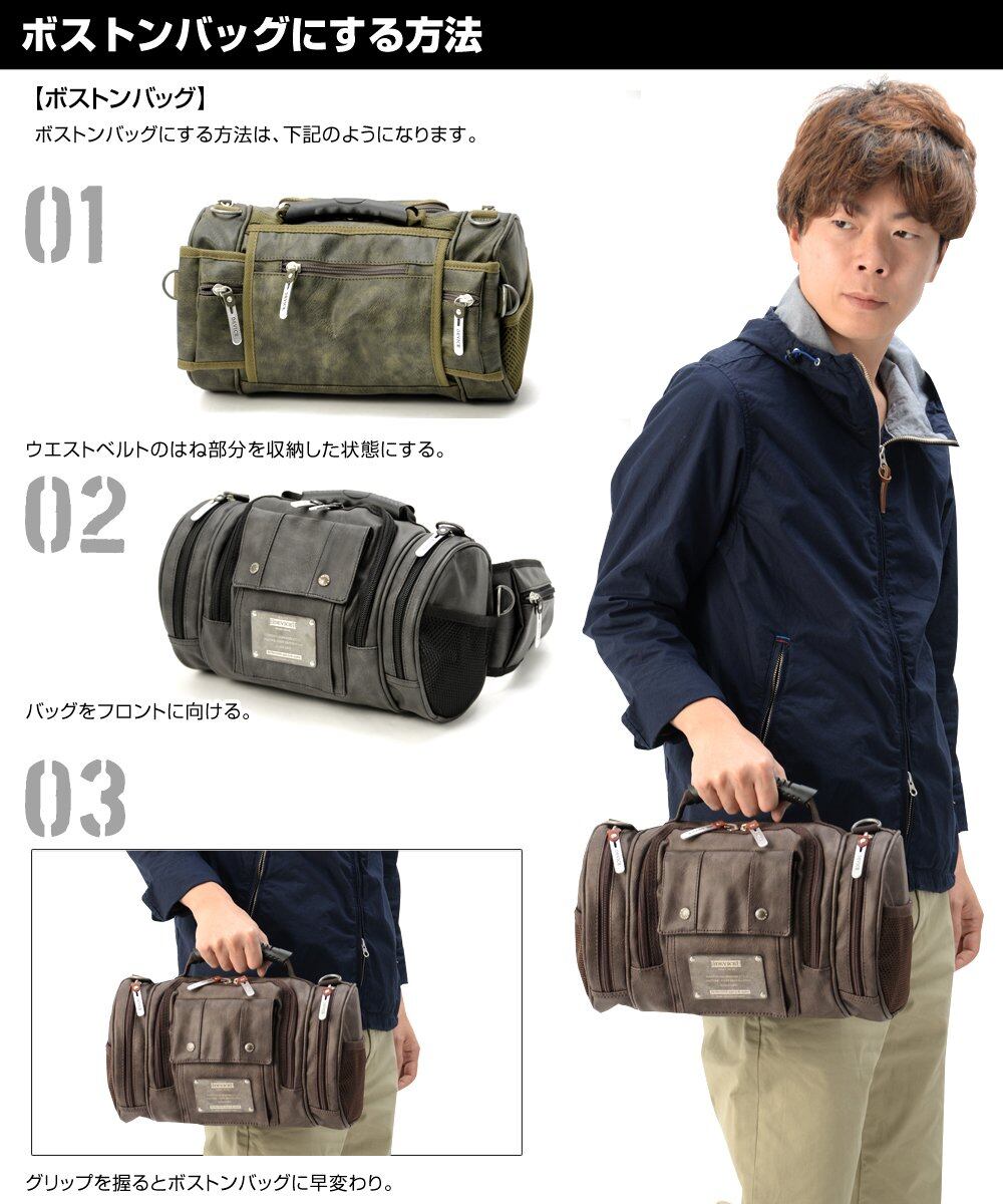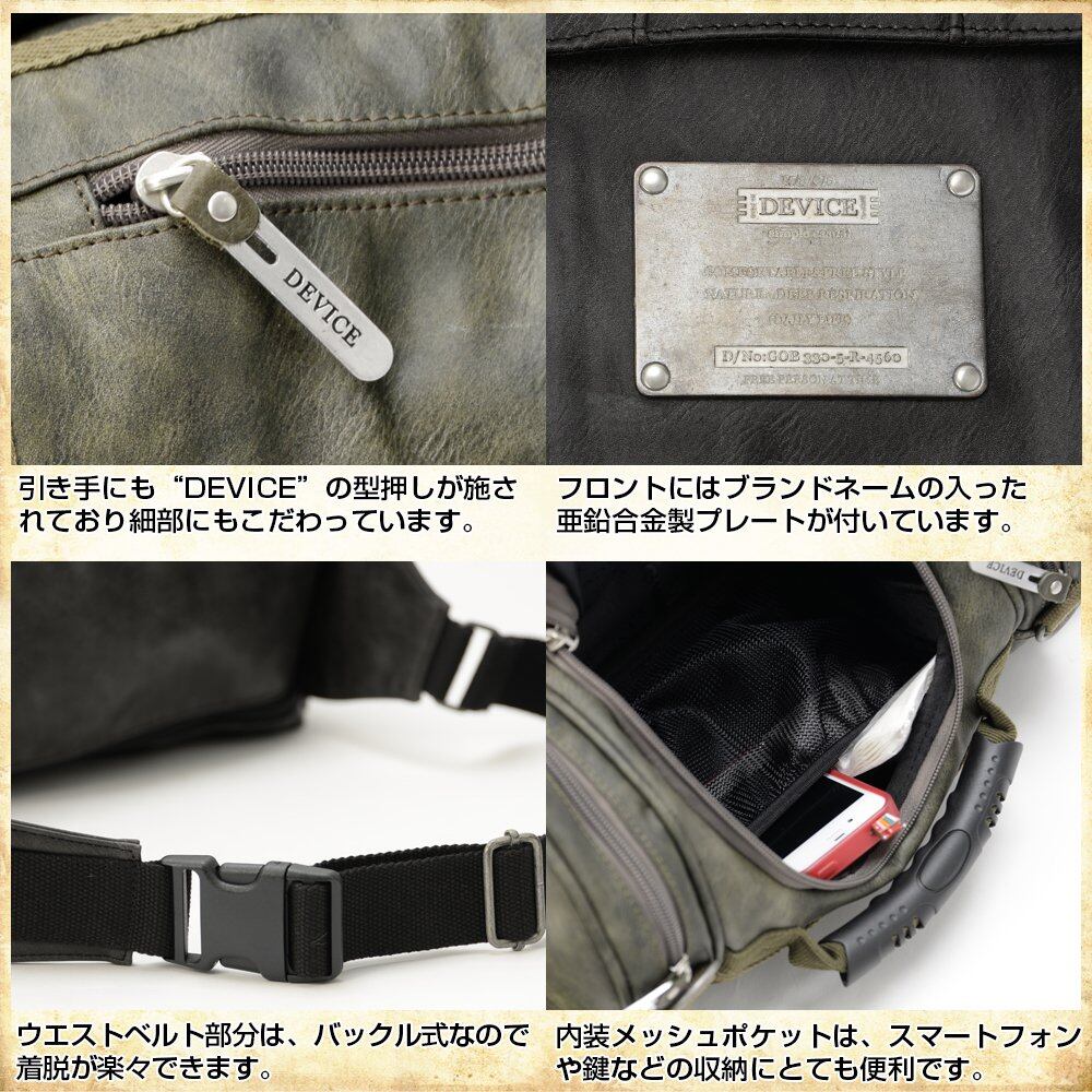 リュック・ウエスト・ボディ・ボストンとして使える4wayタイプのドラムバッグ。リュック時はクロスになった肩紐ベルトとコロンとしたフォルムから、男女問わず使うことが出来ます! 本革のようなムラ感とシボ感が入った肉厚なソフトヴィンテージフェイクレザーは、スタイリッシュでクールな大人のミリタリー感を演出。ブランドネームの入った亜鉛合金製プレートや、ロゴ入りホック、引き手など細部にまでこだわり抜いています。 DEVICEは(株)トップハウスのオリジナルブランドです。 商標登録 DEVICE(デバイス) 登録第 4972736号 第18類 鞄、財布 【商品名】 DEVICE MAD 4way ヒップバッグ 【詳細】 本体:タテ 約17.5cm/ ヨコ 約32.5cm(両サイドポケット含む)/ マチ 約15.5cm リュック肩紐:最短 約82cmから最長 約132.5cm(※ 接続金具のサイズ含まず)/ 幅 約3.8cm ウエスト対応:長さ 最短 約74cmから最長 約112cm/ 幅 約3.8cm (※本体含む) 本体開口:約47.5cm 重量:約1234g 素材:ヴィンテージソフト合皮