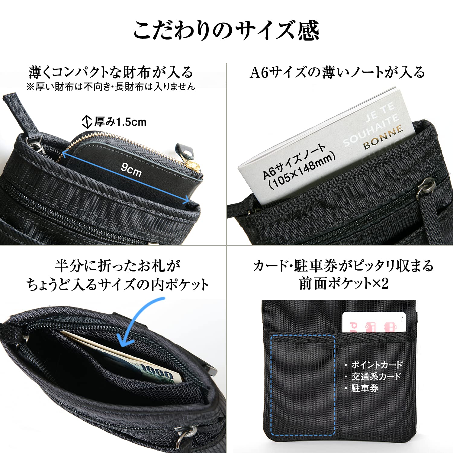 【 薄い・軽い・かさばらない 】スマホと最低限の持ち物(小さい財布、ボールペン、鍵等)を収納するのに使いやすい薄型ミニサコッシュ。※長財布や分厚い財布は収納できません※ 【 多用途 】カラビナポーチ、ベルトポーチ、ネックポーチ、サコッシュバッグ、ウエストに付属のショルダーストラップで装着することも可能 【驚くほど軽い】サコッシュ本体はナイロン製で、なんと『約81g』という軽さ! 【大きめスマホ対応】大画面スマホもすっぽり収まる薄型のポーチは、フォンサコッシュにも最適 【コスパが良い】1年保証 & カラビナとショルダーストラップ、ベルトループでいろいろな使い方ができる、シンプルでシックなデザインは活躍シーン多数 .