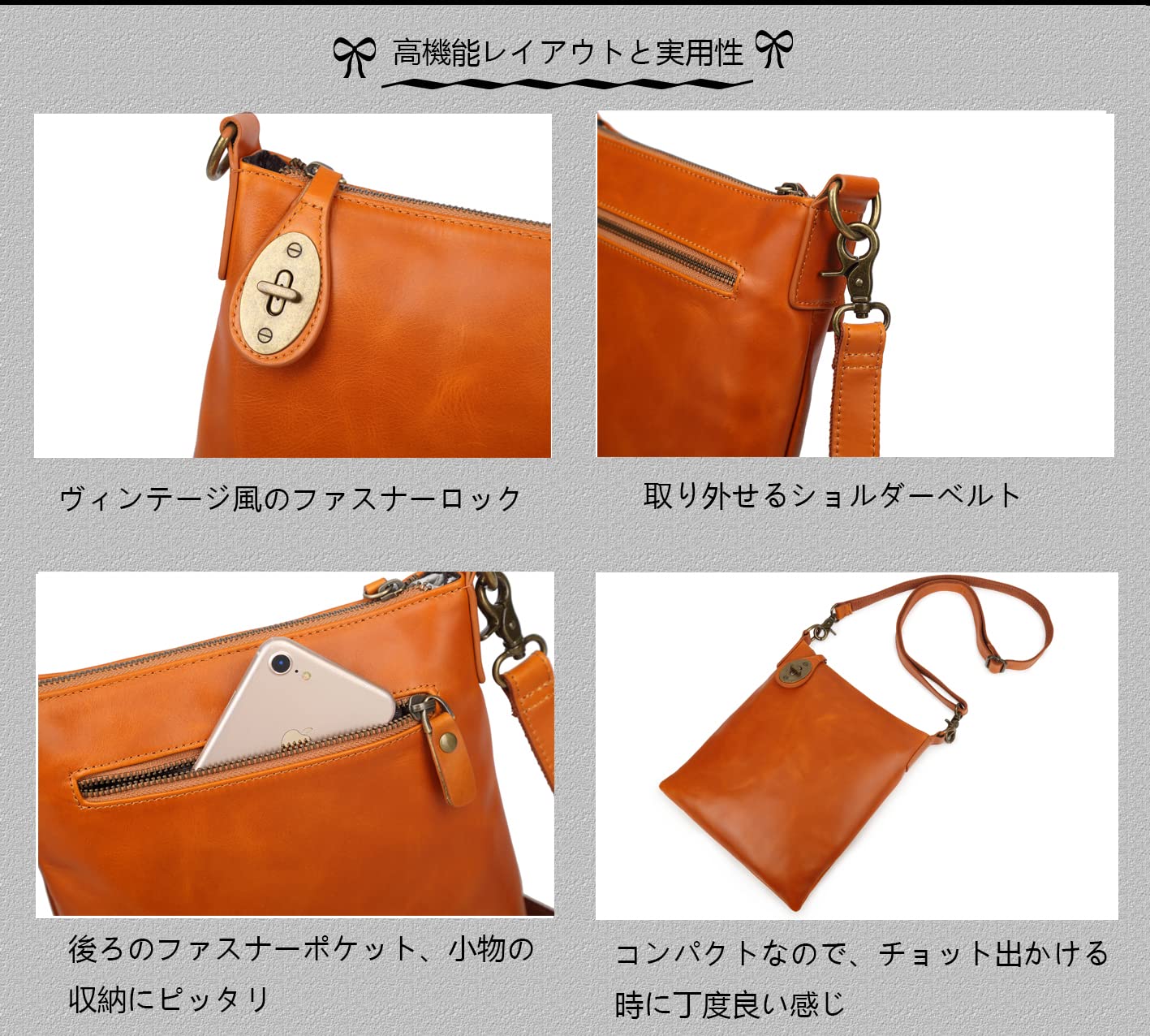 表地素材:オール本革 厳選された上質な牛革を使用。繊細な手触りで、耐摩耗性と耐久性に優れ、使い込むほどに風合いが増します。調節可能なショルダーストラップで、斜め掛けにもワンショルダーにも持ち替え可能。快適な持ち心地で両手が自由になります。