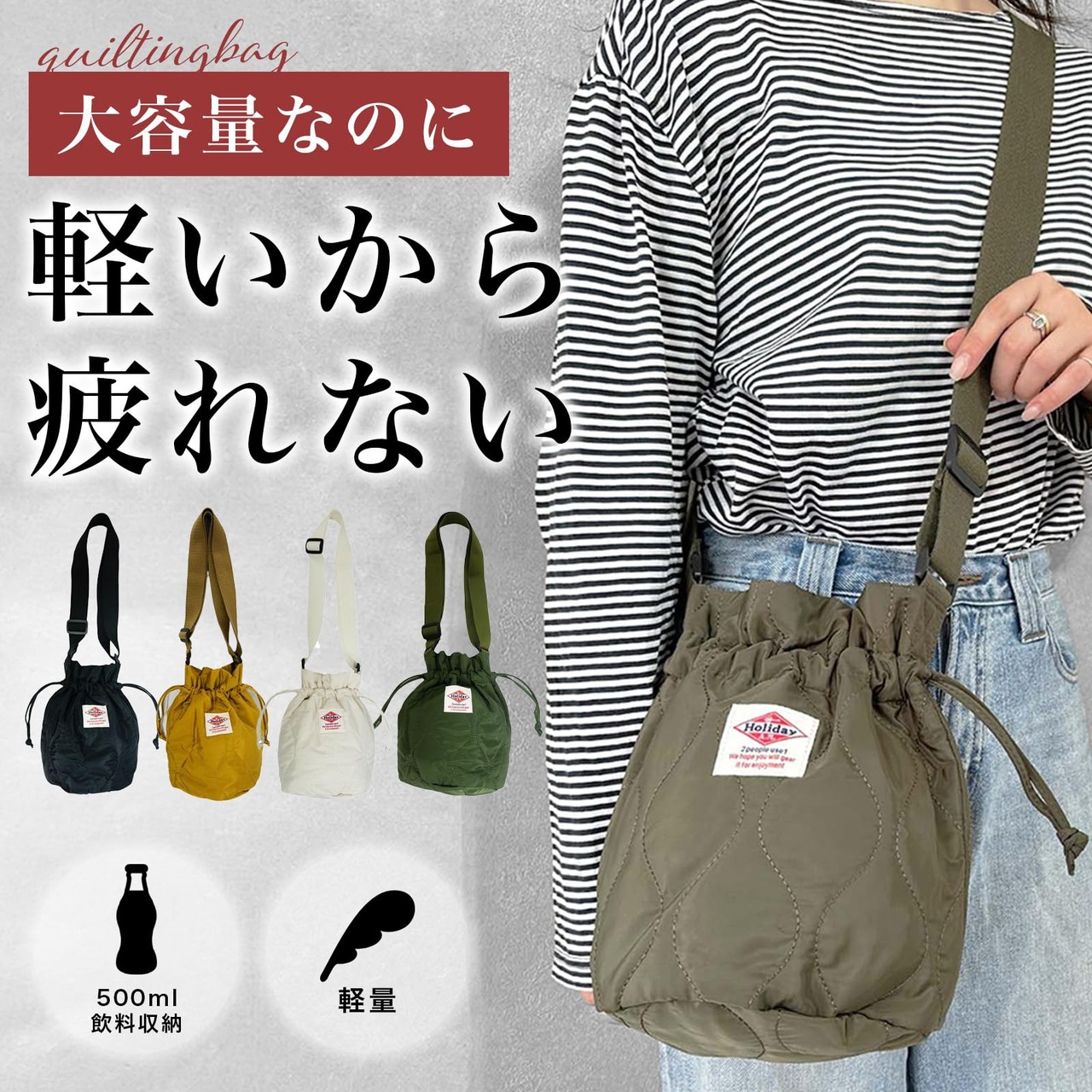 【HolidayA.M.の巾着型ショルダーバッグ】キルティング素材の巾着型ショルダーバッグです。生地はポリエステル素材。軽量で負担にならないのがポイントのバッグです。人気のオニオンステッチのキルティングです。キルティングの暖かみと柔らかさがありながら、しっかりとしています。