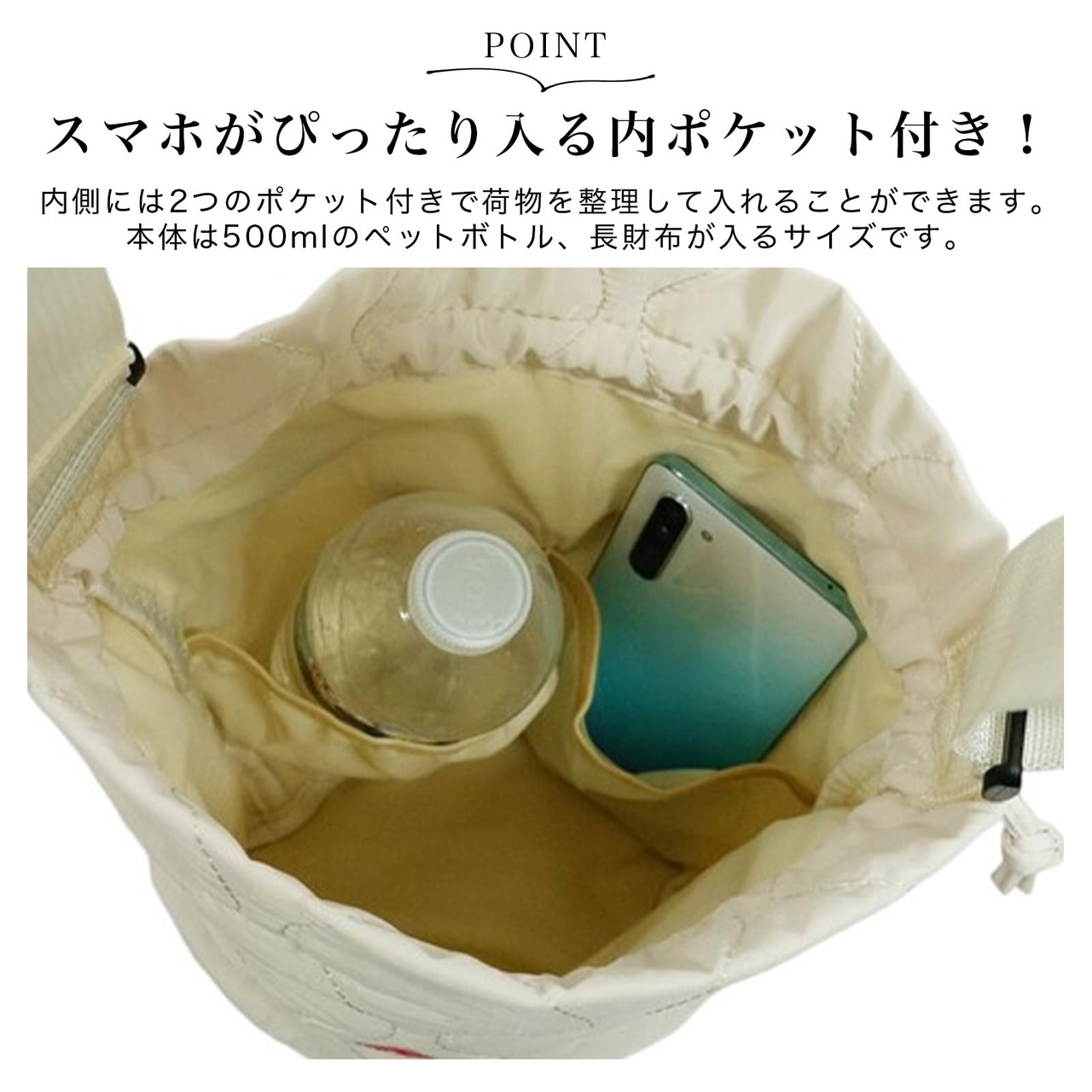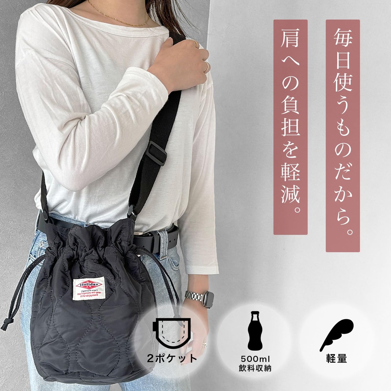 【HolidayA.M.の巾着型ショルダーバッグ】キルティング素材の巾着型ショルダーバッグです。生地はポリエステル素材。軽量で負担にならないのがポイントのバッグです。人気のオニオンステッチのキルティングです。キルティングの暖かみと柔らかさがありながら、しっかりとしています。