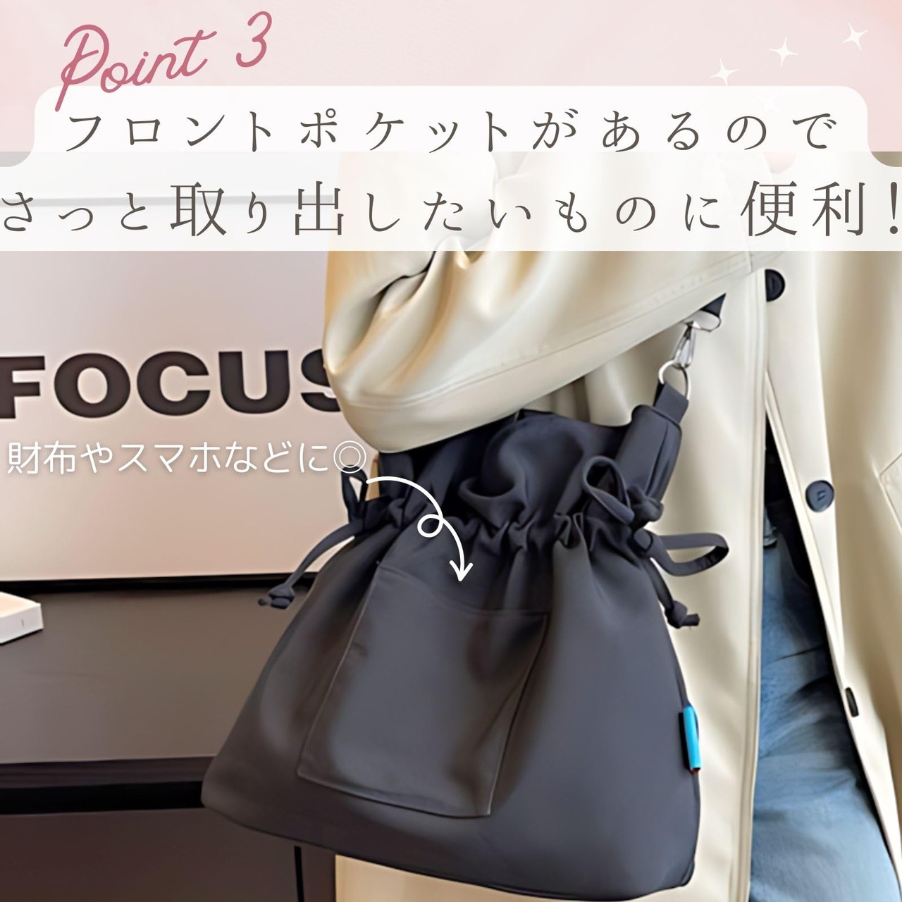フロントポケットがデザインアクセントまた、さっと取り出したいものに便利です。たっぷり大容量も嬉しいポイント。
