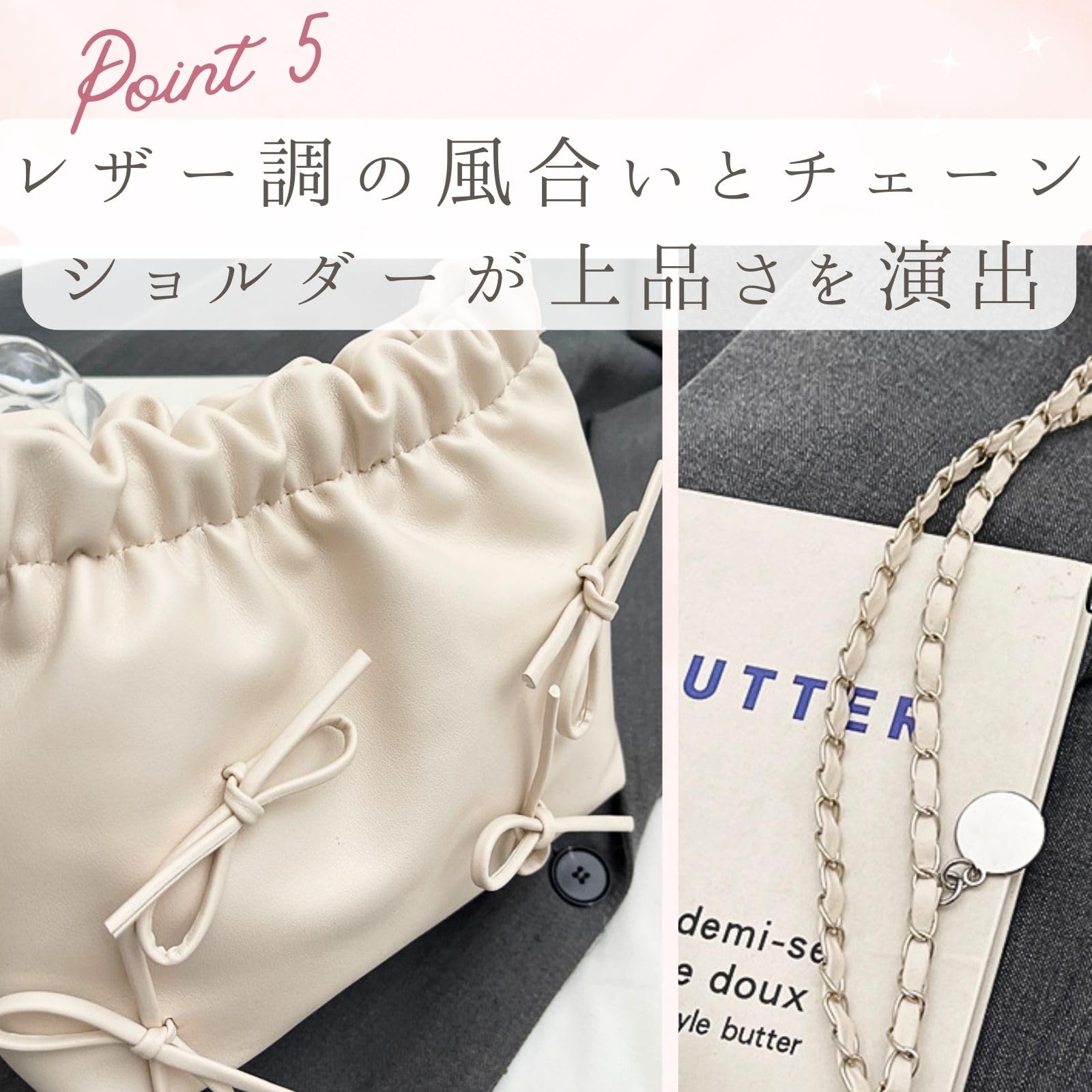 上品さをプラスしてくれるレザー調とチェーンショルダーが、華やかさを演出