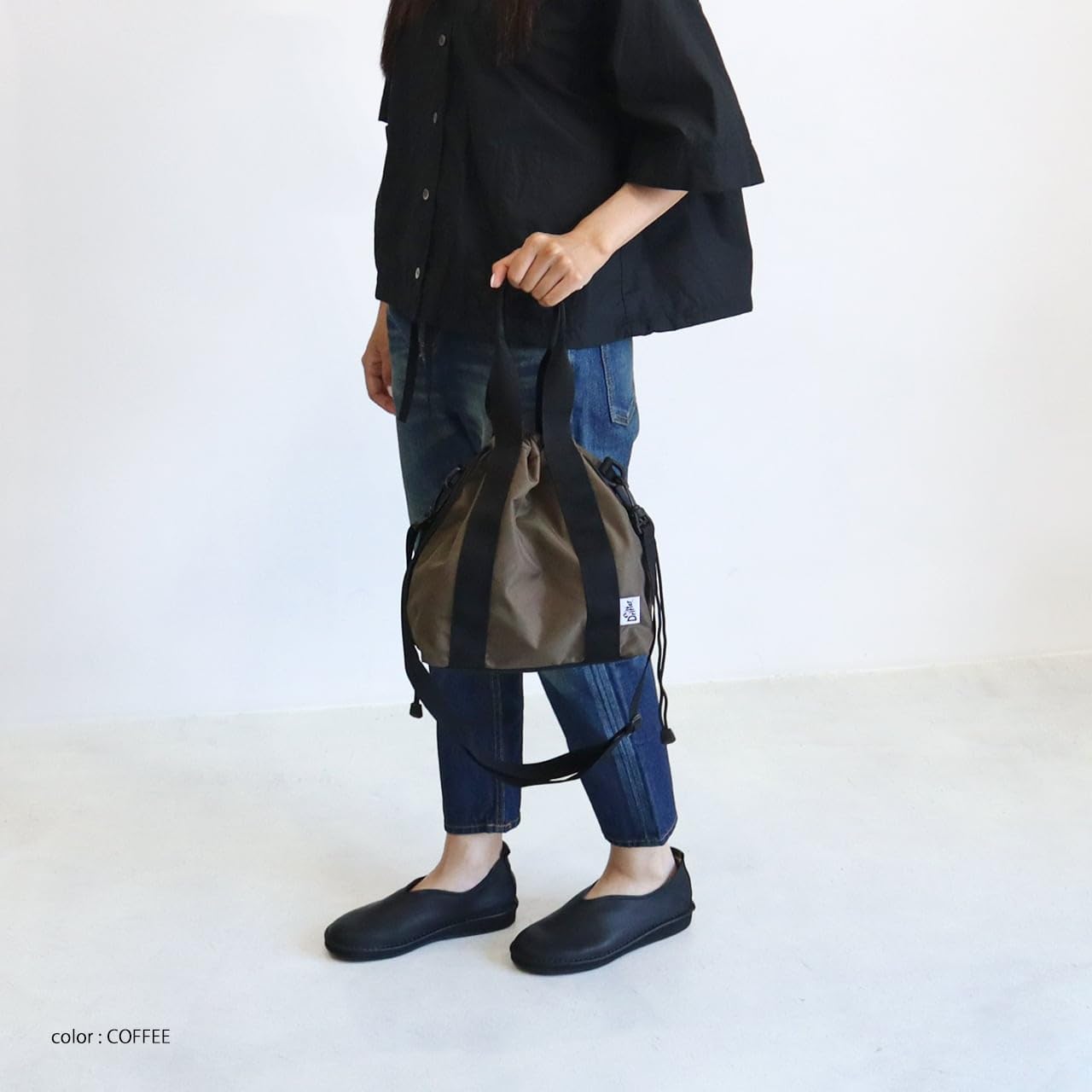 開け口が大きく開き使いやすい巾着タイプのトートバッグ。
