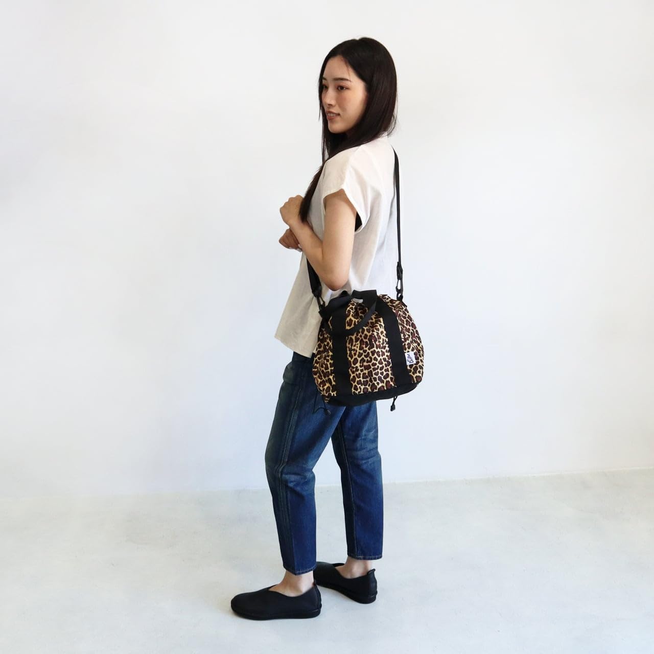 開け口が大きく開き使いやすい巾着タイプのトートバッグ。