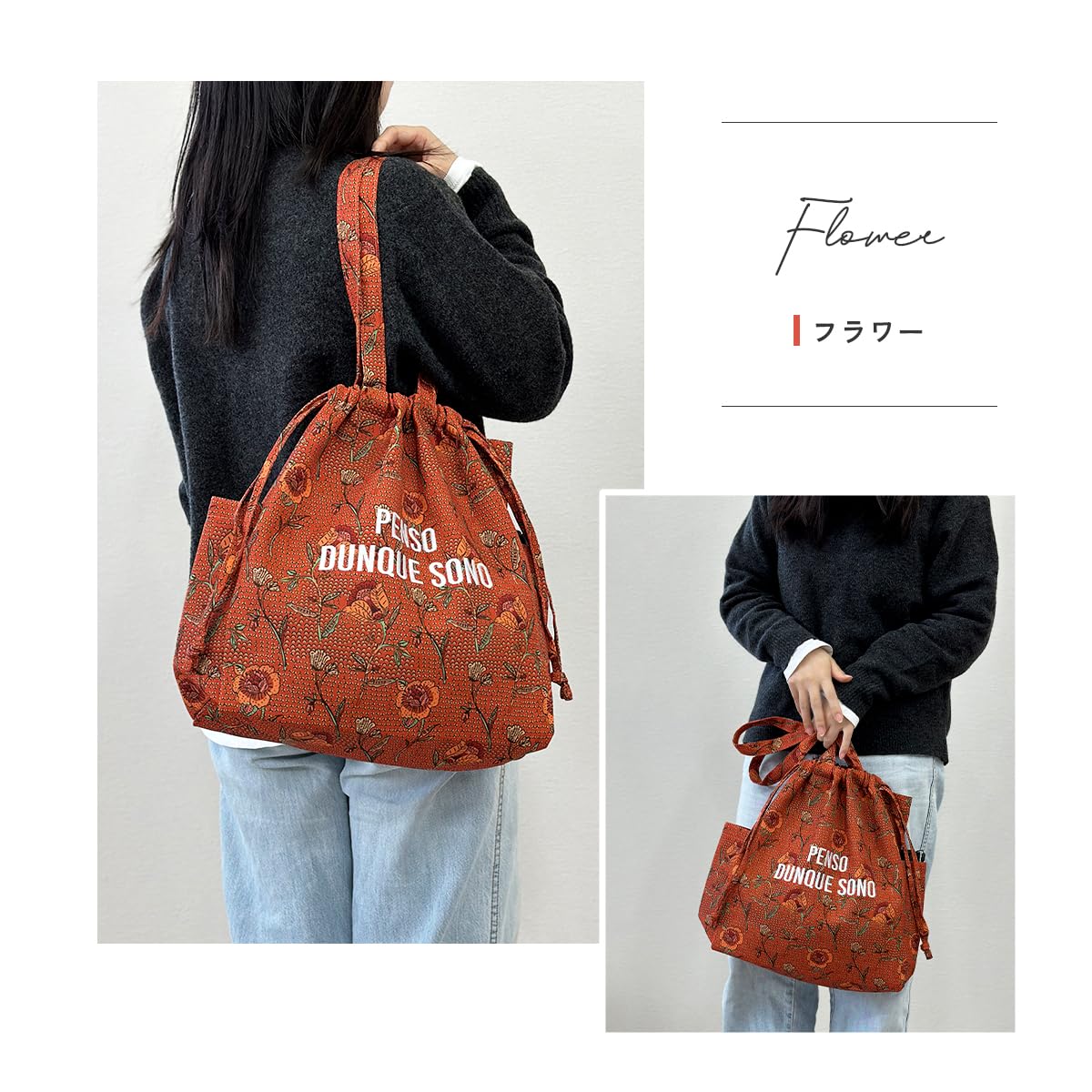 デザイン:総柄プリントデザインがエスニックでお洒落。ドローコードで巾着型に。A4、マチ広で大容量。二つのサイドポケット付きで折り畳み傘や500mlのペットボトルも収納可能◎