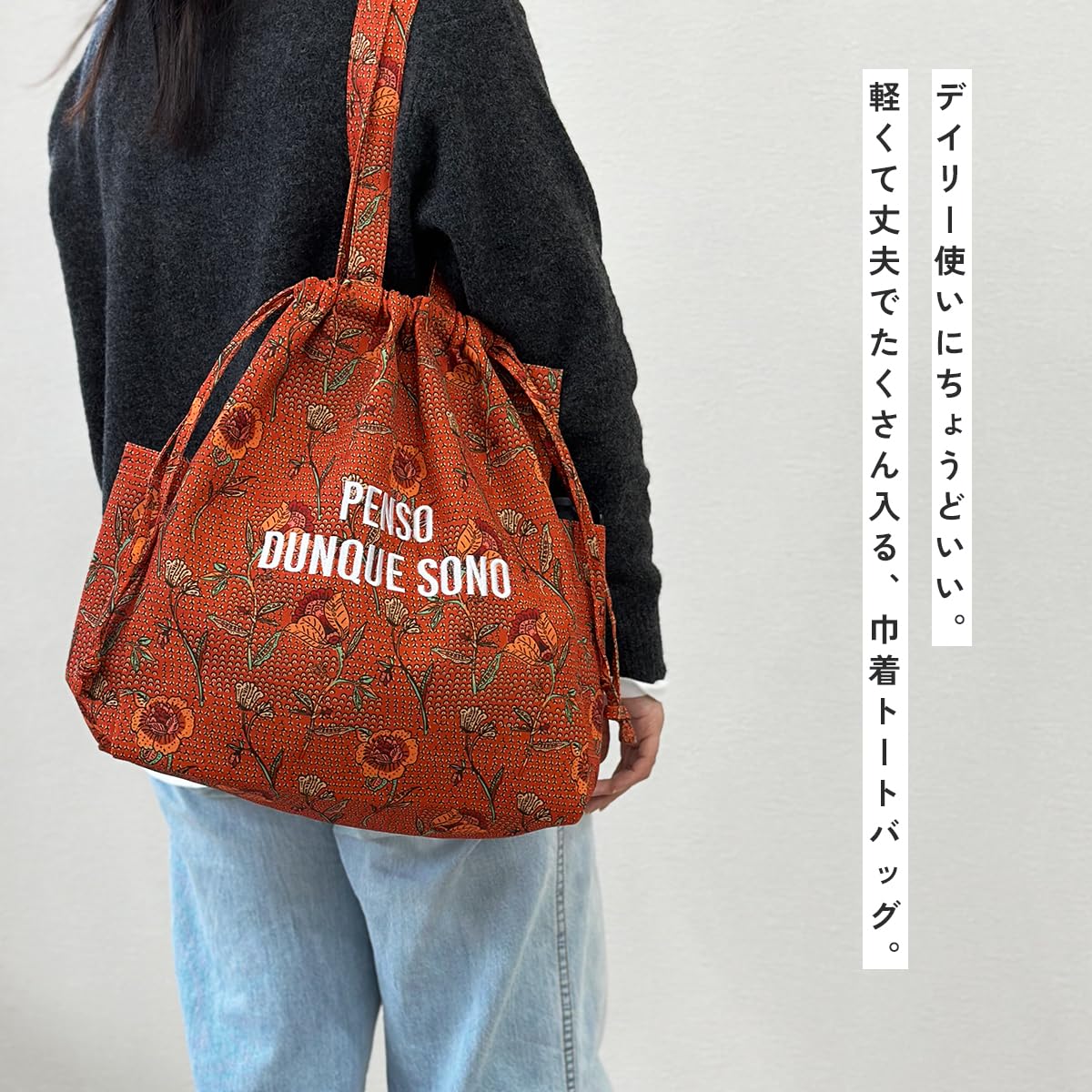 デザイン:総柄プリントデザインがエスニックでお洒落。ドローコードで巾着型に。A4、マチ広で大容量。二つのサイドポケット付きで折り畳み傘や500mlのペットボトルも収納可能◎