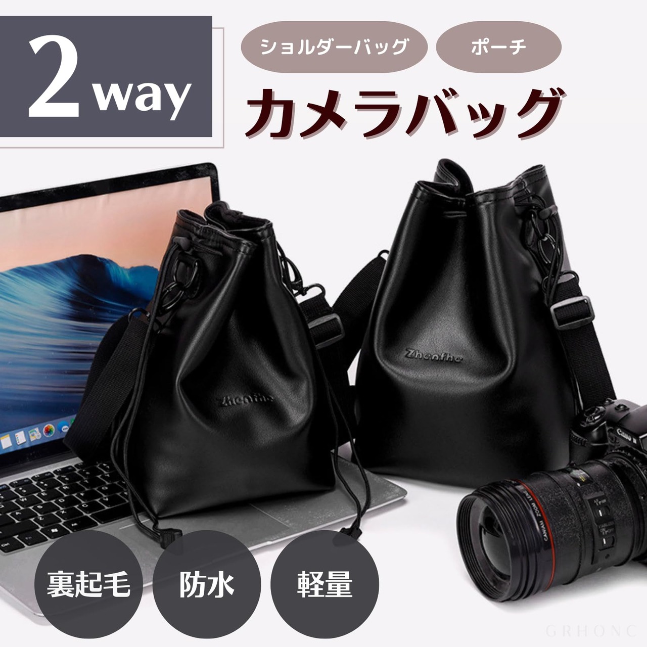 GRHONC カメラバッグ ショルダー 取り外し可能 巾着 おしゃれ PUレザー 撥水加工 小型 軽量 一眼レフ デジカメ レンズ ケース (ブラック M)