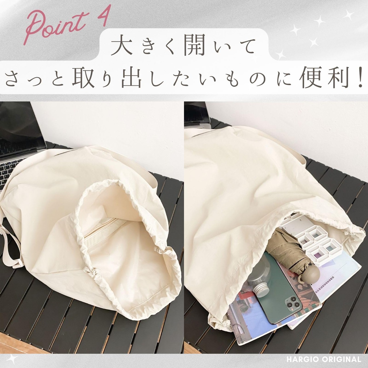 口が大きく開くので、さっと取り出したいものに便利!
