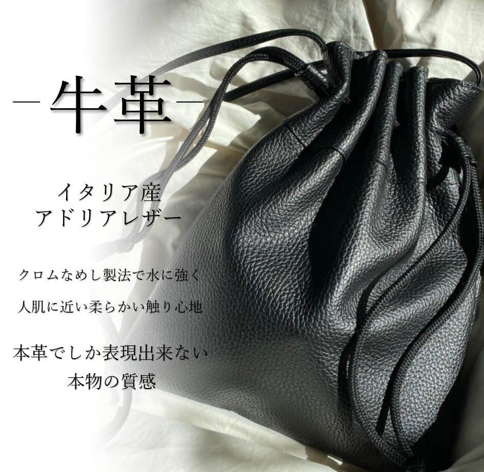 本革巾着バッグでこだわりの触感!!イタリア産マスロット社のアドリアレザー(牛革)を採用。クロムなめし製法で水に強く、人肌に近い柔らかい感触は、常に触っていたくなる極上の触感。
