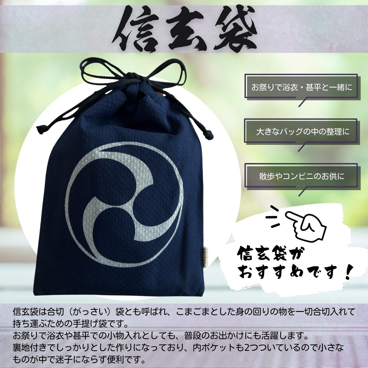 オリジナル柄を抜染した刺子生地を使用した信玄袋です。内ポケット付きでペンや携帯などの小物収納が便利です。