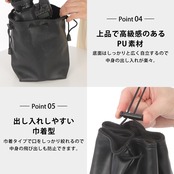 カッコ良く上質感漂うPU加工されたカメラケース。出し入れしやすい巾着型で大人カジュアルに合わせやすく、普段使いもばっちりなショルダーバッグ。Sサイズでも小型ミラーレスカメラがすっぽり入ります。