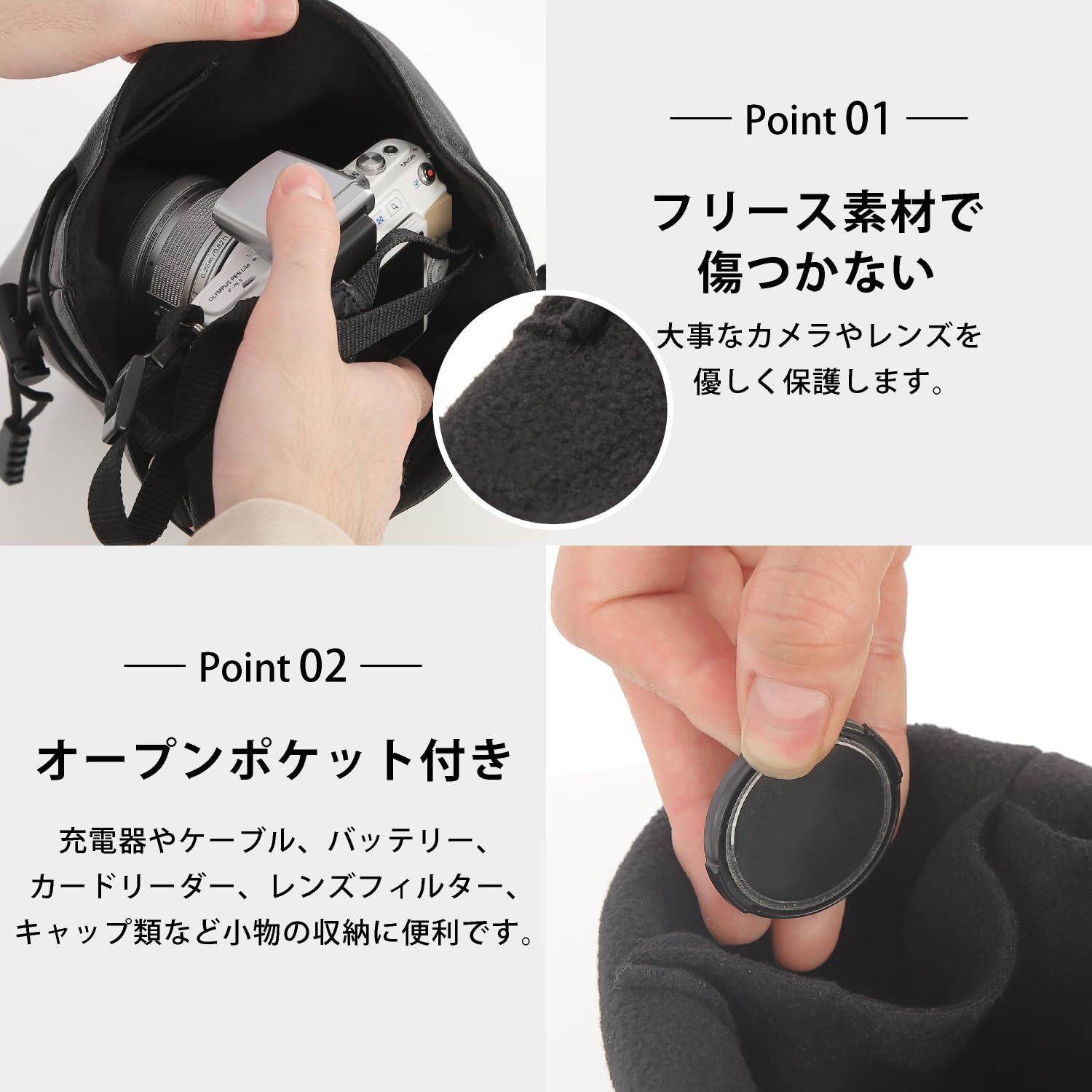 [FUPUONE] カメラバッグ レンズケース 軽量 巾着型 ミニサイズ 裏地 フリース (ブラック S)