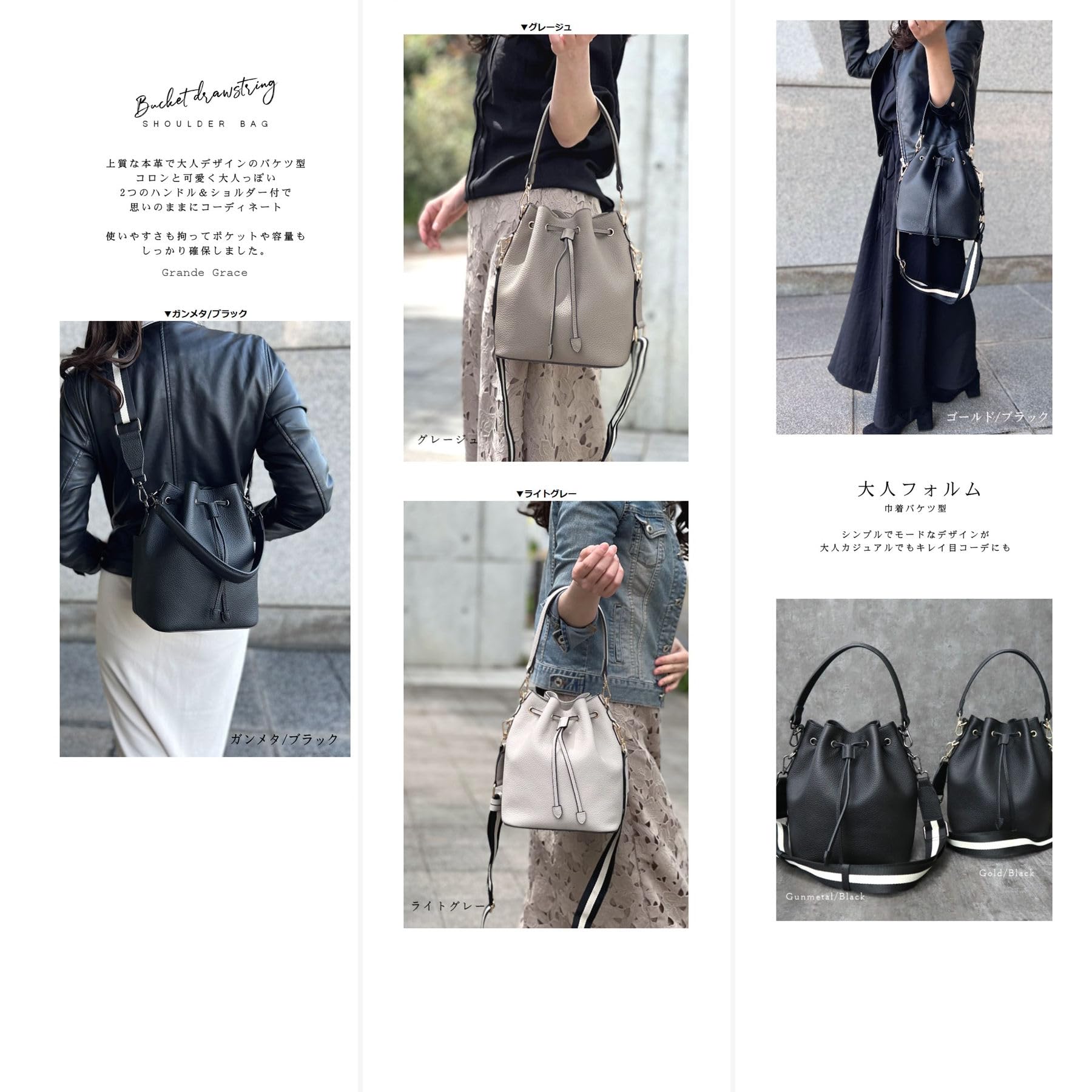 コロンと大人可愛いデザインの本革 Ver.バケツ型。2つのハンドル&ショルダー付。