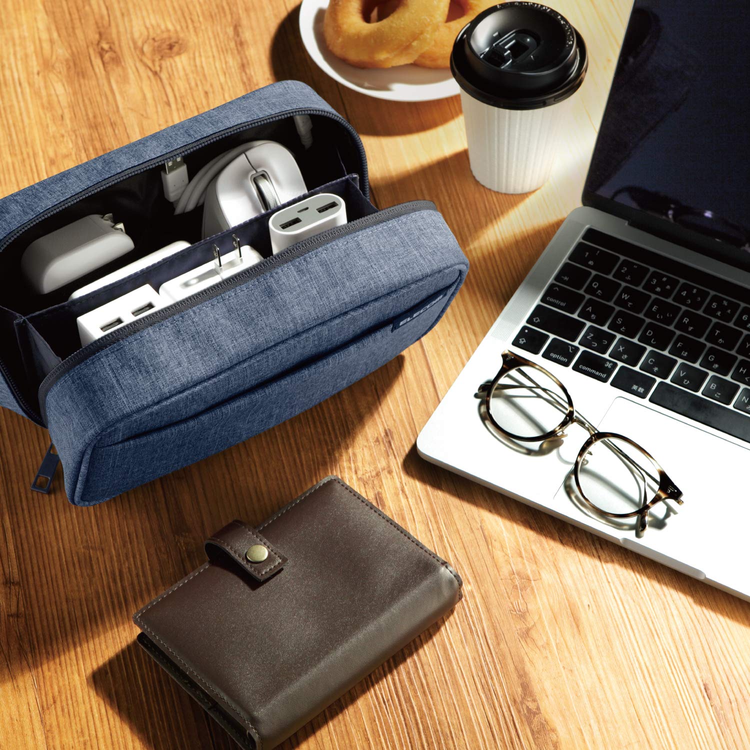 周辺機器からビジネス用品までをまとめて収納可能な、収納物が一覧しやすい自立型ポーチです。