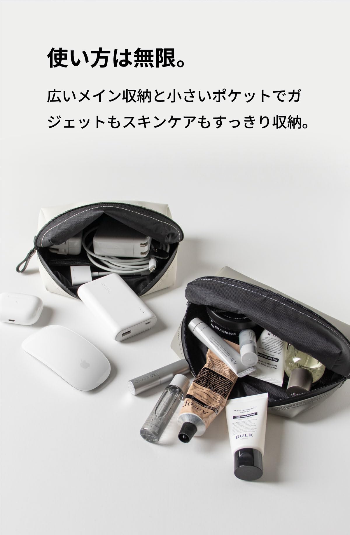 asoで人気の耐水小型ポーチTOFTPOUCHにマチが付いて、より幅広い用途に使えるマルチポーチになりました。内装はジッパーポケットやスリット付きで使い易い。