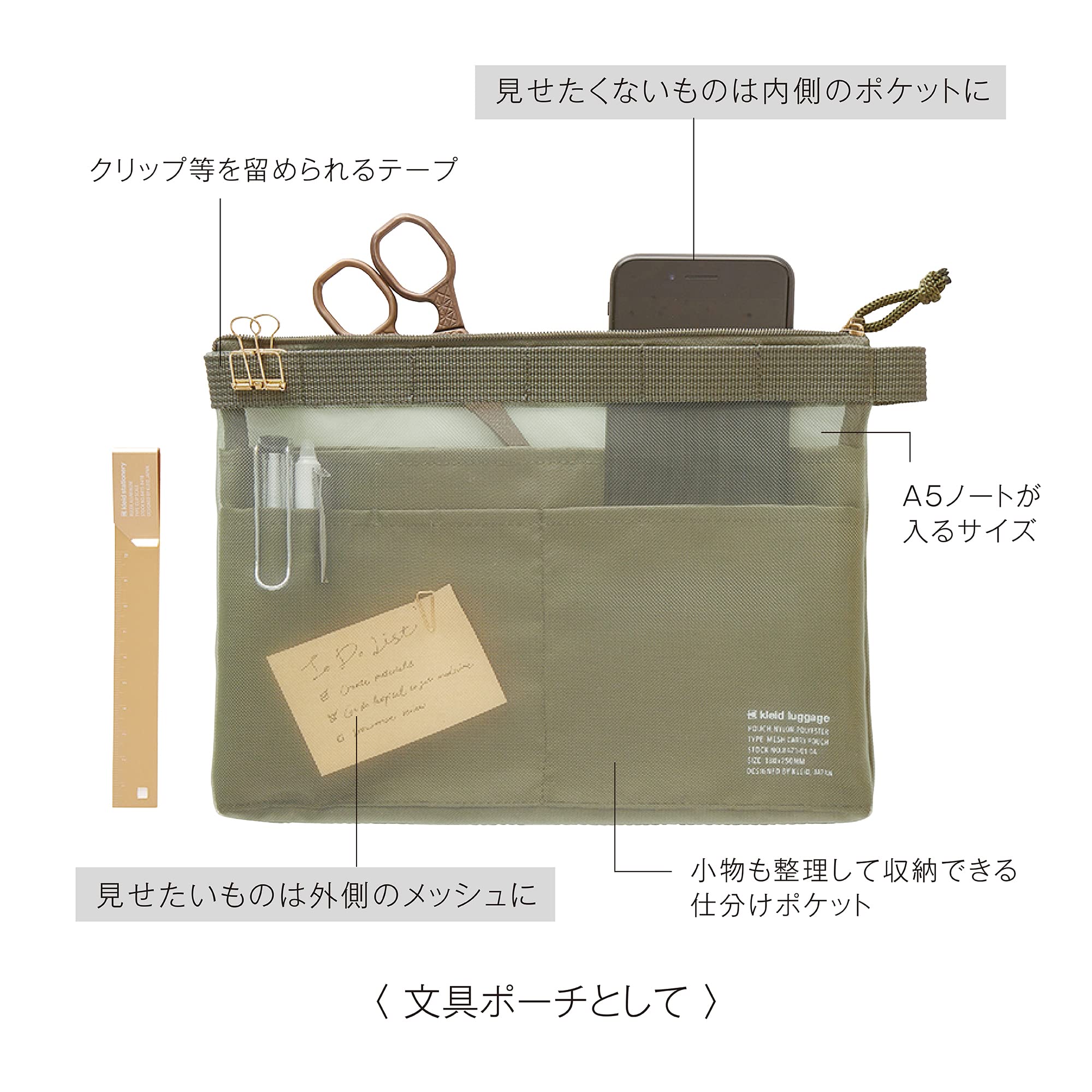 中身が瞬時に確認できるメッシュポーチの内側に、便利な仕分けポケットを付けました。見せたいものをメッシュ(外側)に、見せたくないものをポケット(内側)に使い分けて収納可能。マチ付きなので、A5サイズのノートや文房具をまとめてスマートに持ち歩けます。