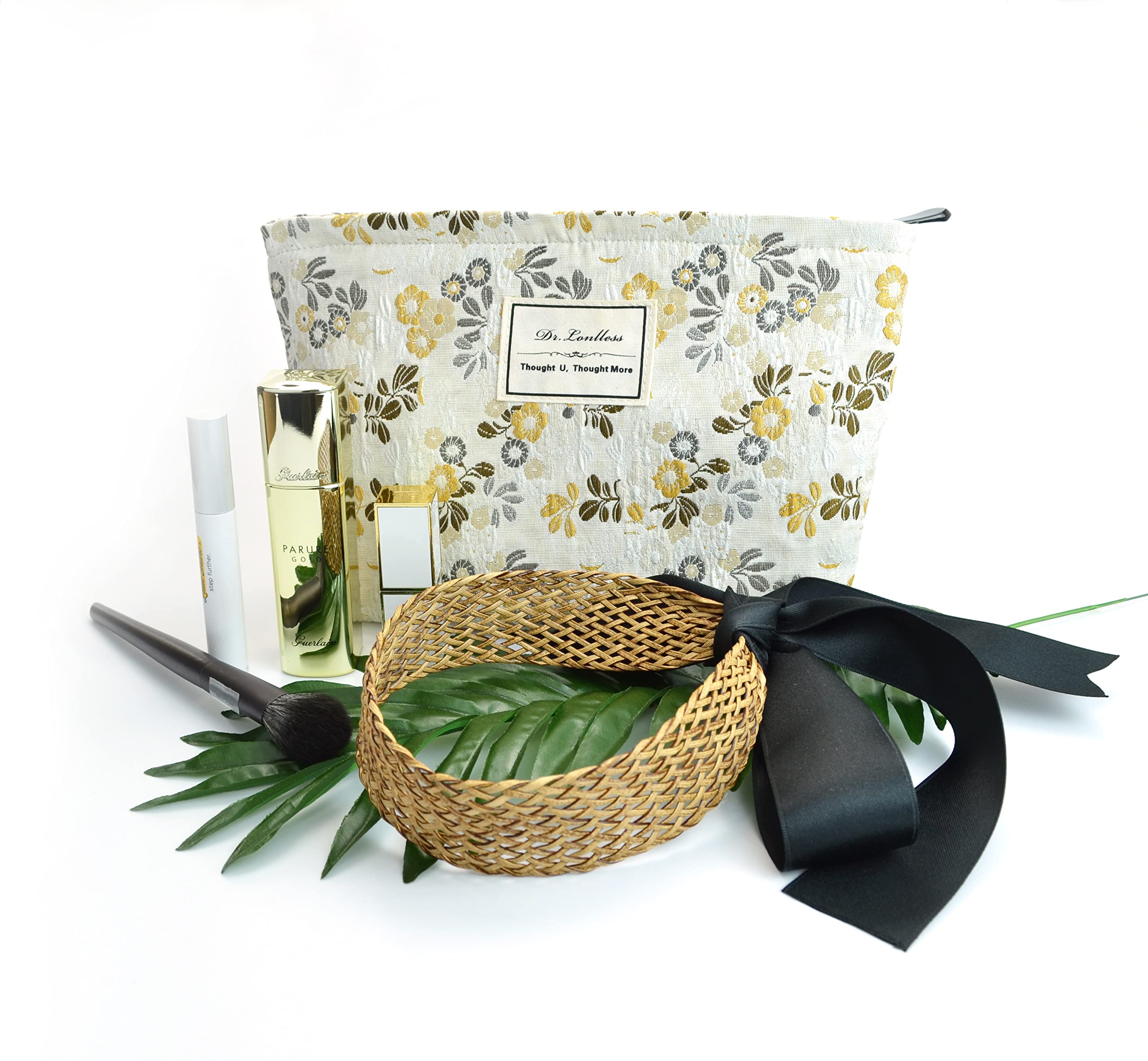 「素材」コスメポーチの生地は、主にジャカードプロセスで織られており、素敵なカラーマッチングと立体的なパターン施されています。 化粧ポーチの裏地は、手触りの良い純綿の帆布で作られています。