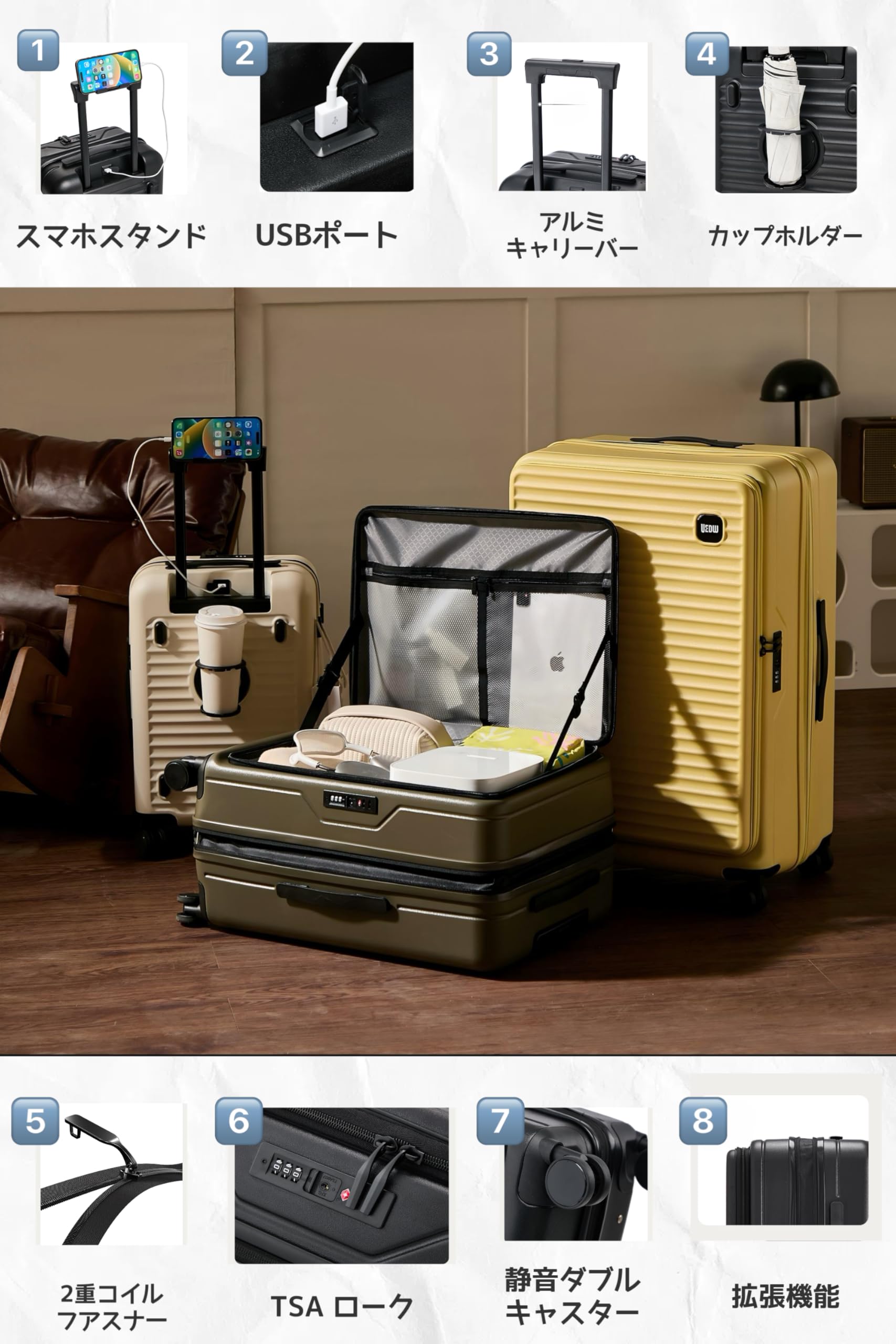 【ダイヤル式TSAロック、サイドフック、折り畳み式カップホルダーを採用】 アメリカなど保安検査を実施している国に行く際に不可欠なTSAロックを搭載し、どこへ旅行しても安心。※暗証番号だけでロックを開けるため、キーは同梱されません。画期的な折り畳み式カップホルダーを搭載、もっときれいで、もっと省スペース!一般的なカップホルダーは、折り畳んだ際に必要な奥行きは3-5CMです。当店のカップホルダーは折り畳んだ際に必要な奥行きがただ1CMのみです。それで、メイン荷室の利用できるスペースが増えました。