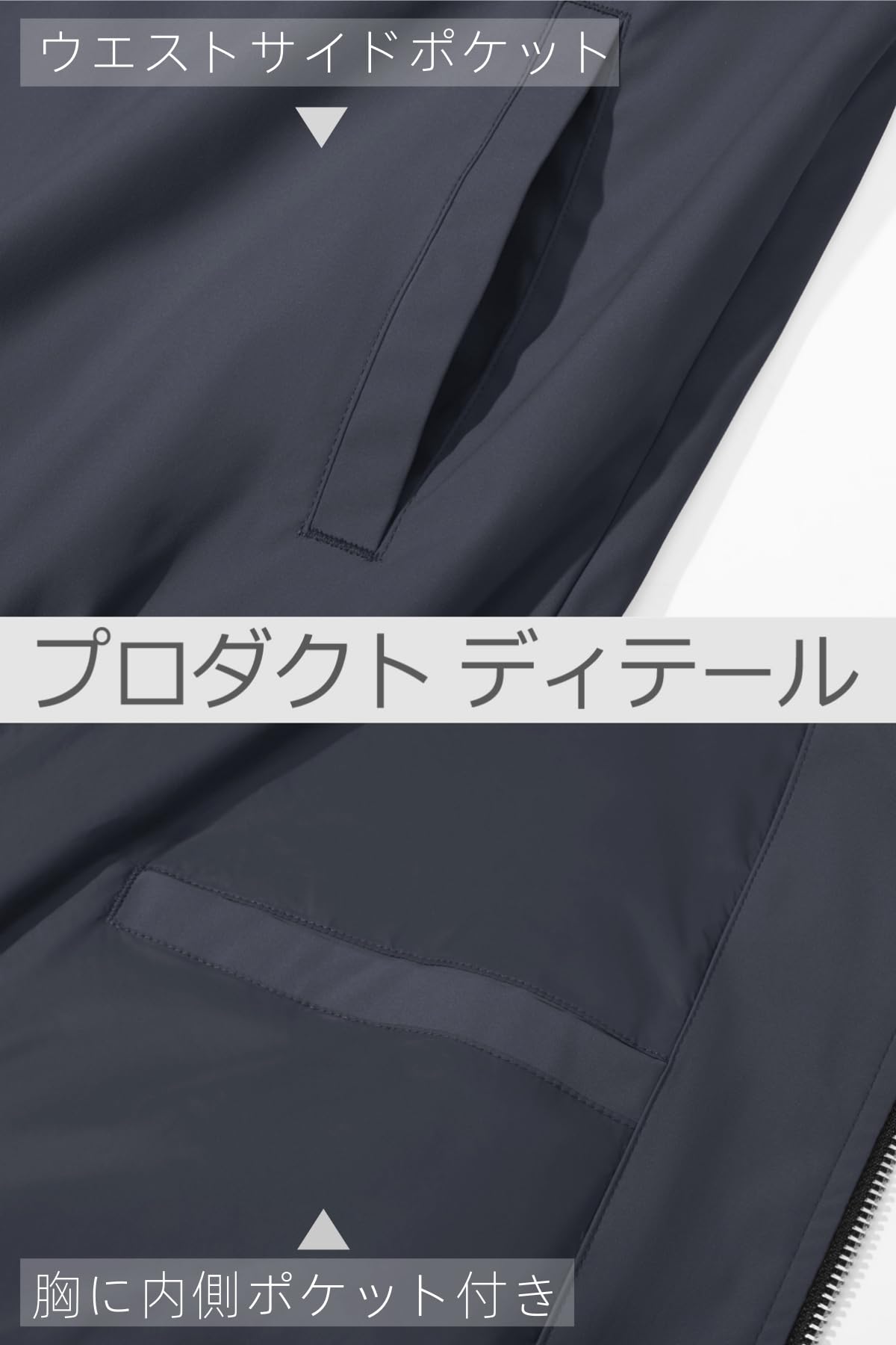 【デザイン】サイド×2、インナー×1、日常の収納ポケットがあり、便利な収納スペースを備え、必要なアイテムをスマートに持ち運べます。裾・袖口・襟に伸縮性があり、動きやすく快適な着き心地です。