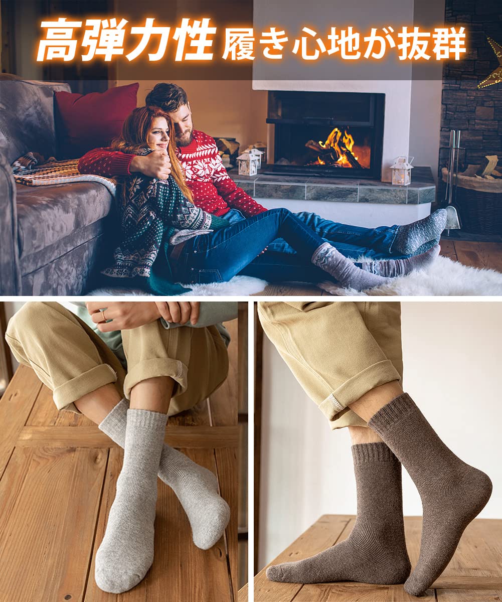 【極厚裏パイル・38℃恒温】靴下は丈夫な材料と丁寧な編み方で足全体フィットし、足にピッタリ、ズレにくいです。上質なウール質を採用して、裏地は極厚手起毛、保温性は普通の靴下の5倍、厳冬にアウトドアしても保温性が良い 靴下 メンズ 厚手。履き口からつま先まで全部ふわふわとして、まるで毛布に包まれているような、滑らかな肌触りで足全体をやさしく包み込んでくれるから、同時に厚地裏起毛のデザインを採用し、足の熱量をしっかりとロックさせて、不思議な38℃恒温を実現します。