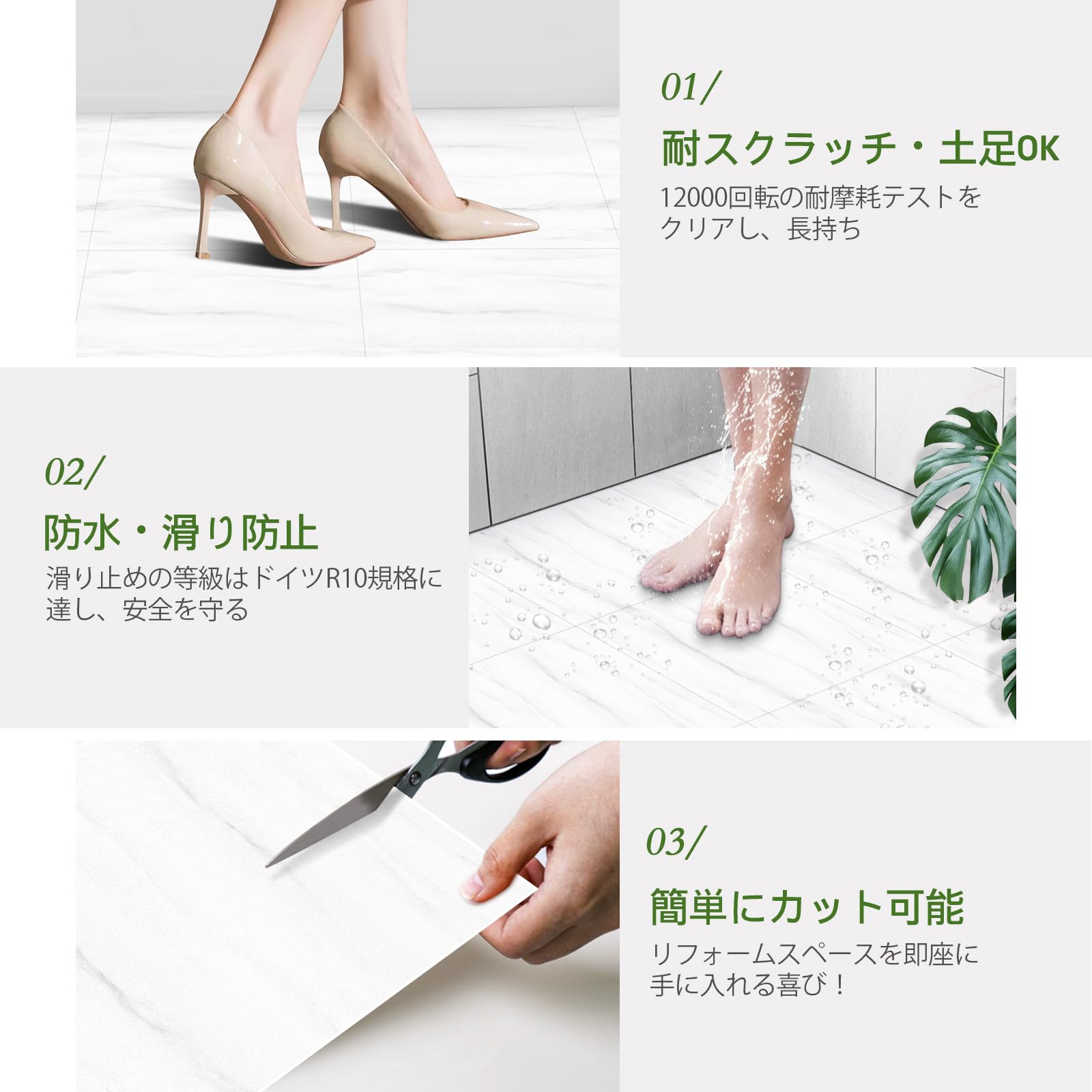 素材の利点:1) 防水&抗菌防カビで、滑り止めの等級はドイツR10規格に達しており、洗面所、トイレ、浴室 、キッチン、床暖房、玄関、あらゆる床面に安心して使用できます。2) 12,000回の耐摩耗試験をクリア、抜群の耐摩耗性を持つ、土足OK、長持ち。猫の爪とぎでも傷つきにくく、ペットのいるご家庭にもおすすめです。3) SGS認証の四大品質試験に合格し、安全で環境に優しい素材です。