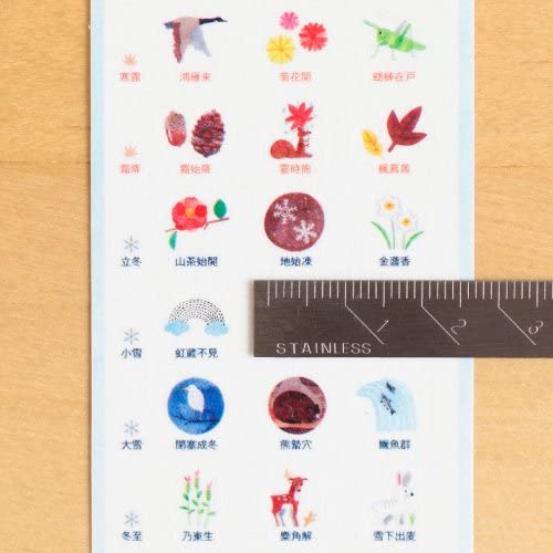 日本の四季をもっと身近に感じるダイアリーシール。。二十四節気や節句の日、吉日など、暦の魅力が満載のシールです。。七十二候にあわせて貼れる、日本の暦のためのスケジュールシールです。。8月7日から1月30日ごろまでの、秋と冬の三十六候分を1枚のシートにまとめました。春と夏は別売りです。。後ろが透ける半透明タイプのシールなので、文字や罫線の邪魔をすることがありません。やわらかい風合いの和紙のシールです。。七十二候のことがわかる、小さな暦のしおりがついています。。日本製。。。