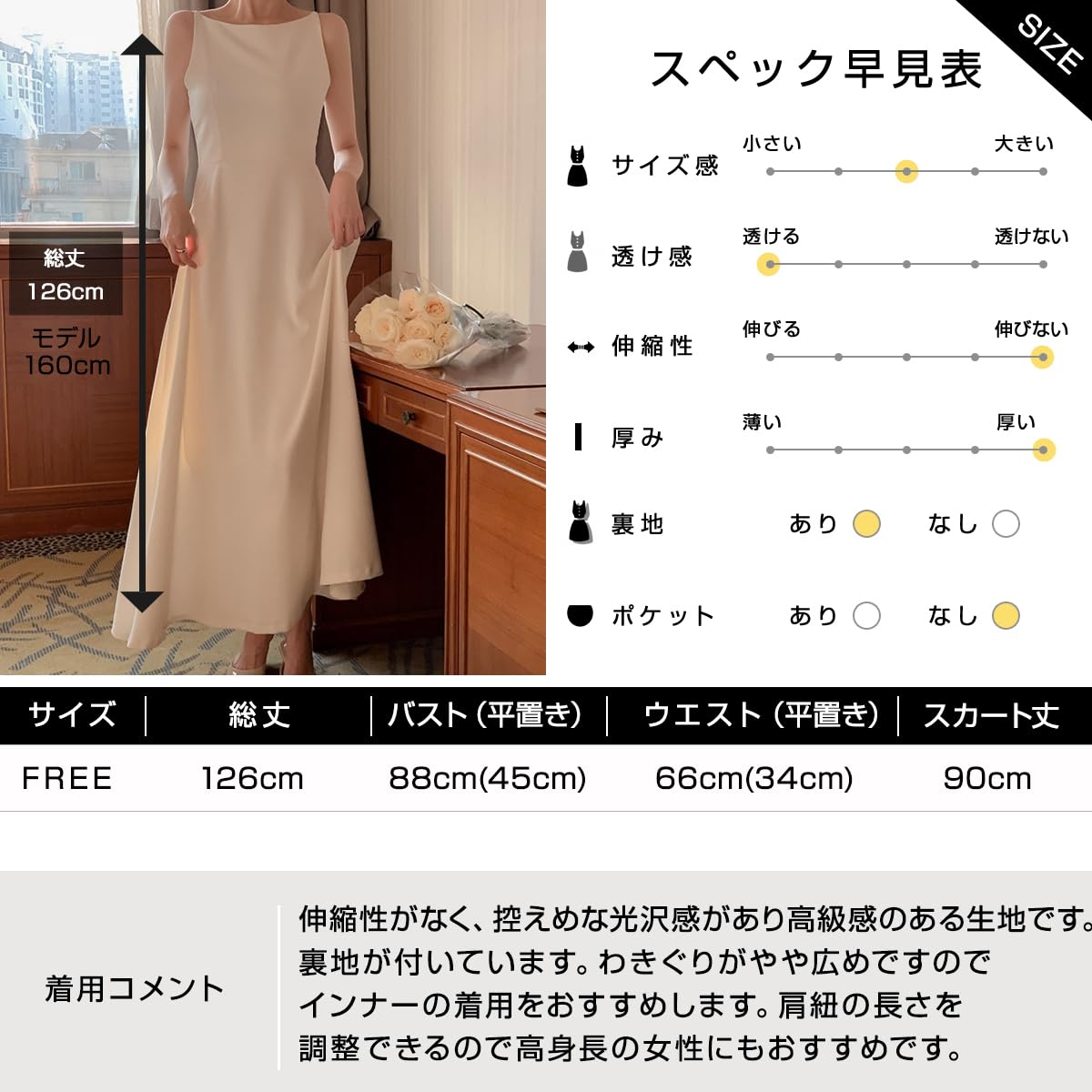 【洗練されたシルエット】シンプルなデザインなのですっきりした印象で着れます。ふわっと広がるフリルスカートは上品に女性らしさを演出します。立体感のあるシルエットなのでどの角度から見ても着映えます。また、ウエストの位置が高いのでヒールと合わせるとすらりとスタイルアップします。