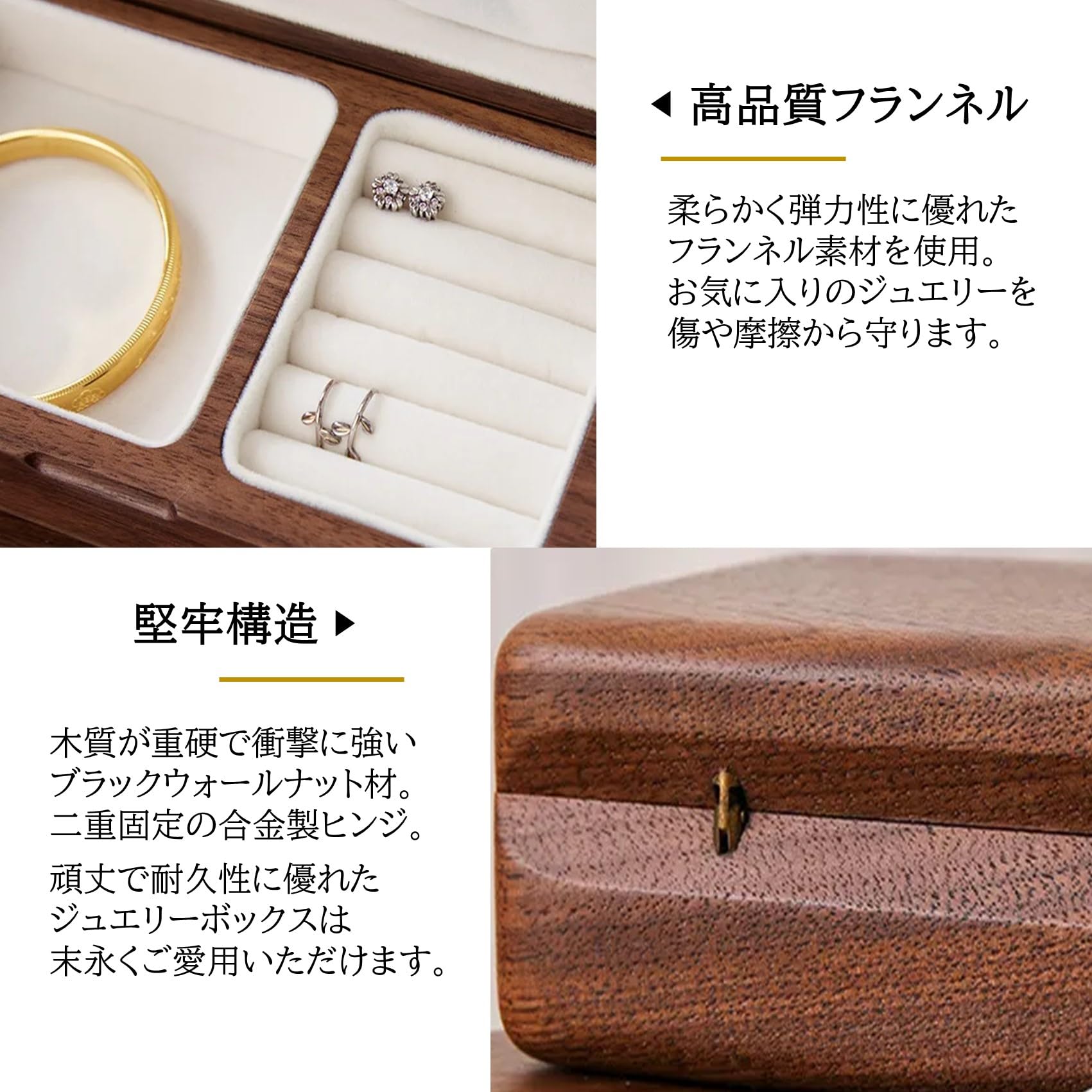 【堅牢構造】 黒胡桃材ブラックウォールナットは木質が重硬で衝撃に強い素材です。また本体と蓋を接合するヒンジは合金製で二重固定仕様となっております。頑丈で耐久性に優れたジュエリーボックスは末永くご愛用いただけます。
