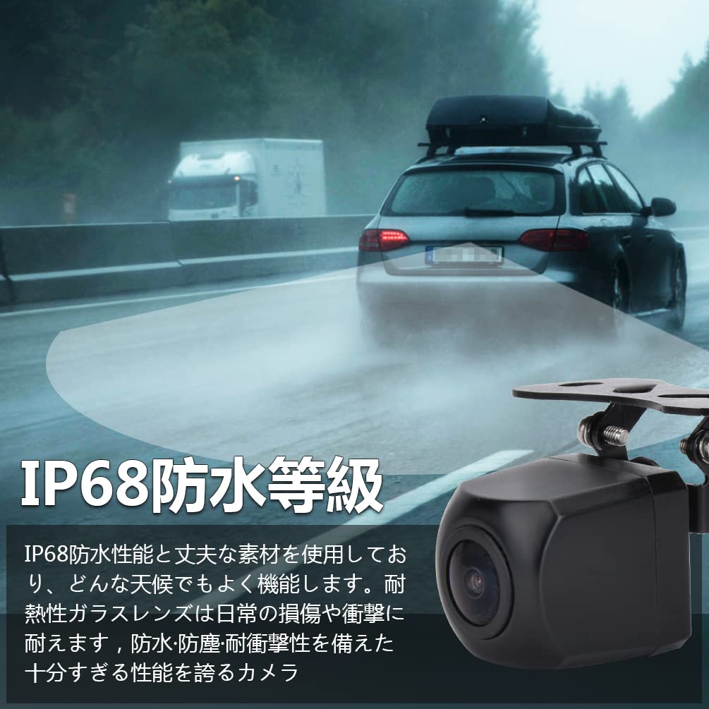 【IP68高防水性能】最上級の保護等級IP68を取得します。防震、 防干渉、防塵、高温/低温に耐える、耐久性全てを備えた最強の車載用バックカメラです。