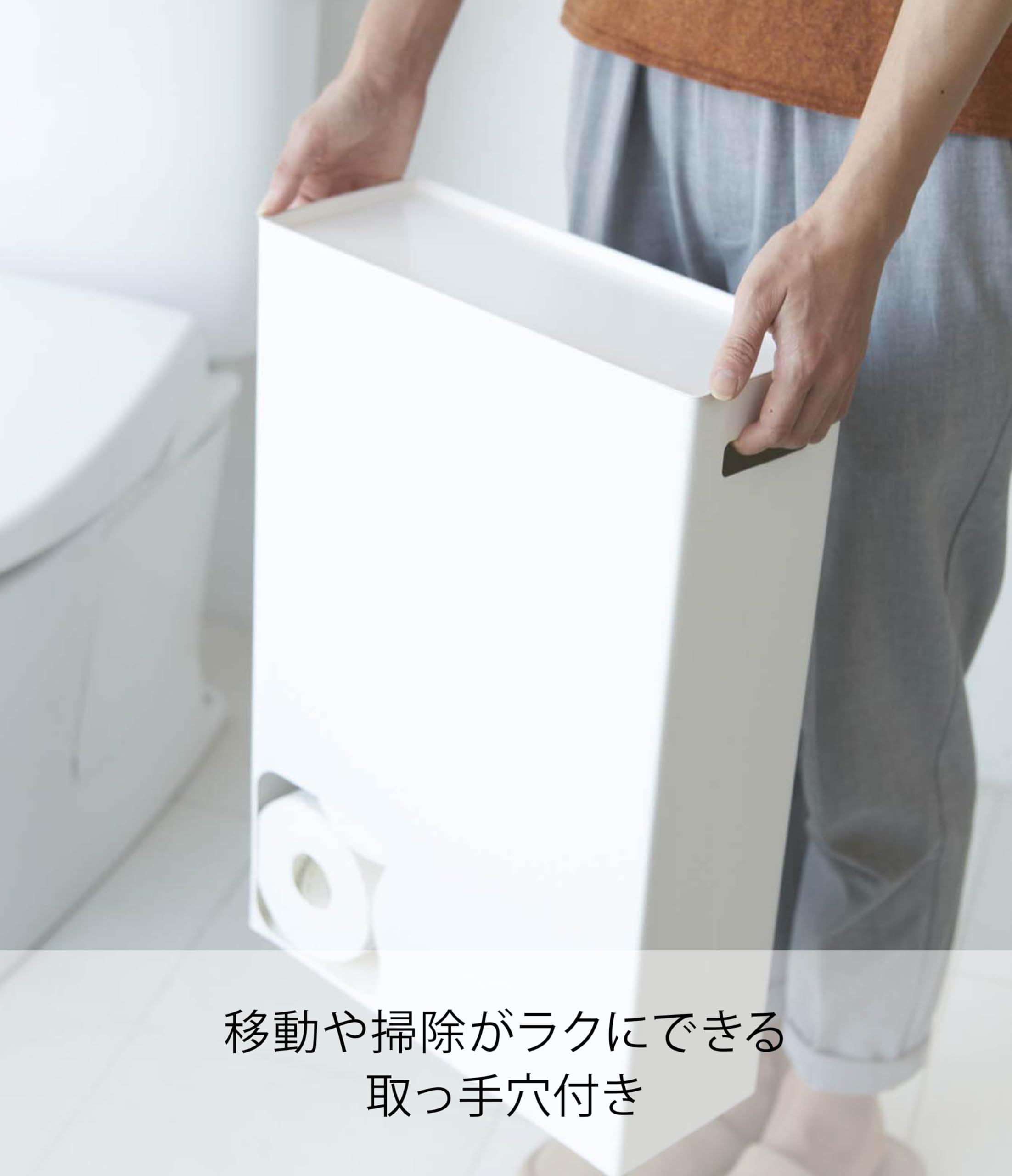 ●トイレットペーパー12ロールを美しく隠してスリムに収納。1ロール取り出すと次のロールが出てくる便利な構造。コーナーに置けば存在を主張せず、空間に美しくなじみる。 取り出し口が両面に貫通しているので設置の向きに困ることもない。トイレットペーパー12ロールをまるごと収納できる。取っ手穴が付いているので移動や掃除もラクラク。1個取り出すと次のロールがスタンバイ!