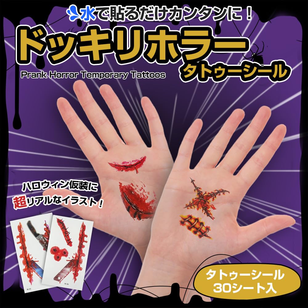 【貼りやすくて剥がれにくい】本製品は使い方が簡単で、初心者でも扱いやすいのが特徴です。水を使って貼るタイプなので安全。一日だけのハロウィンメイクを思いっきり楽しめます。しっかり肌に密着して落ちにくいのがポイントです。剥がす時も簡単で、セロハンテープやガムテープを上から貼って剥がせばすぐに取れます。手軽に扱えるタトゥーシールなので、首や腕、足首、背中など、場所を選ばず自由に貼ることができます。【貼り方】フィルムを剥がし、濡れたペーパータオルでずれないように押さえながら20秒ほど湿らせます。剥がすと徐々に発色し始めます。腕や足、体、胸、肩など、お好きな場所に簡単にお楽しみいただけます。【安心素材、防水で長持ち】肌に貼るだけで簡単にリアルな傷が完成する、特殊メイク用の傷跡タトゥーシールです。こすって肌に転写するタイプなので、普通のシールとは違い、すぐに剥がれ落ちません。材質はポリエステル上質紙とEVA樹脂接着剤を使用しており、肌に優しい成分で有害物質は一切使っておりません。防水加工が施されているため、お風呂に入っても通常3〜6日程度持ちます。よく動かす関節部分でも1〜2日が目安です。