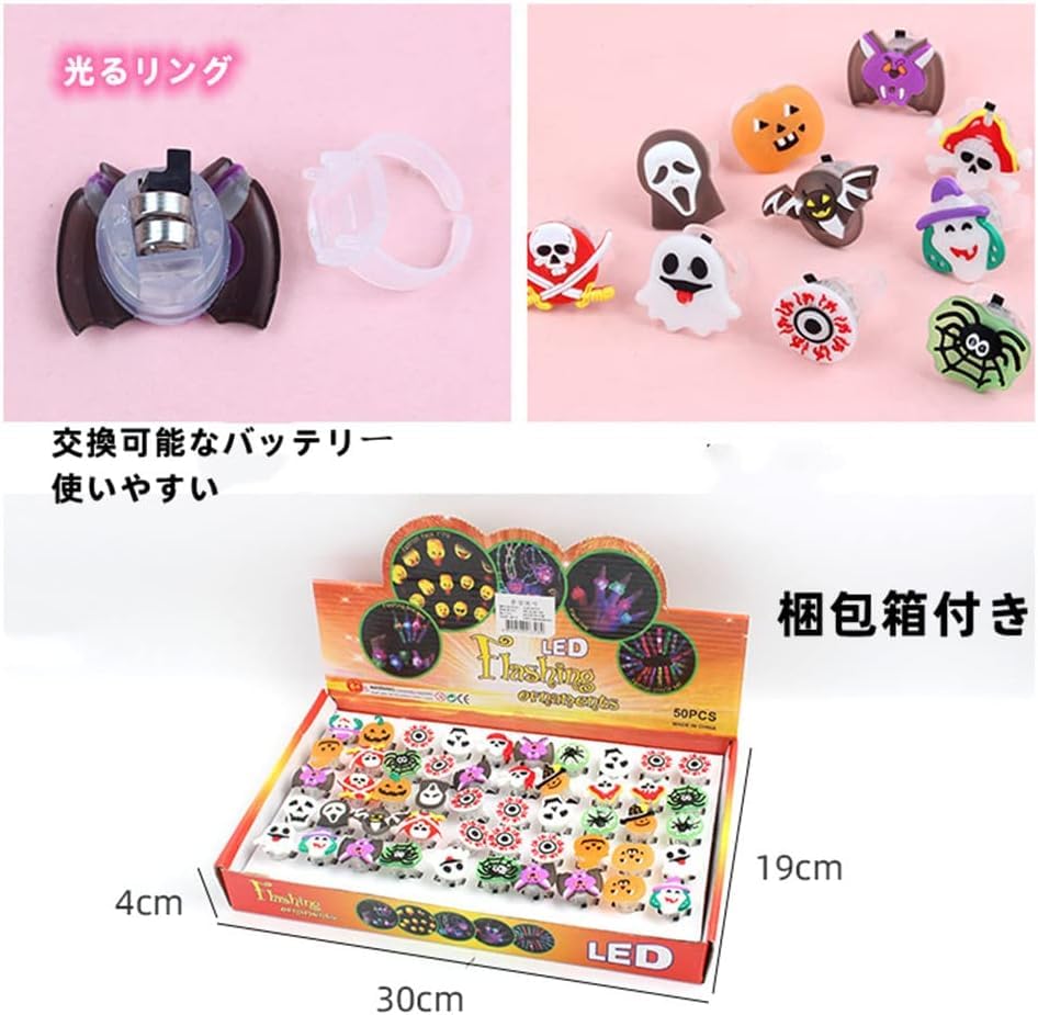 【大容量ハロウィンプレイセット】:光る指輪×50個、光るネックレス×6個。合計56点豪華セットです。パターン:LED発光のカボチャ、コウモリ、クモ、ゴースト、ドクロ、片目など様々なキャラクターが存在する。※注:スタイルと色はランダムに販売されており、指定されていません