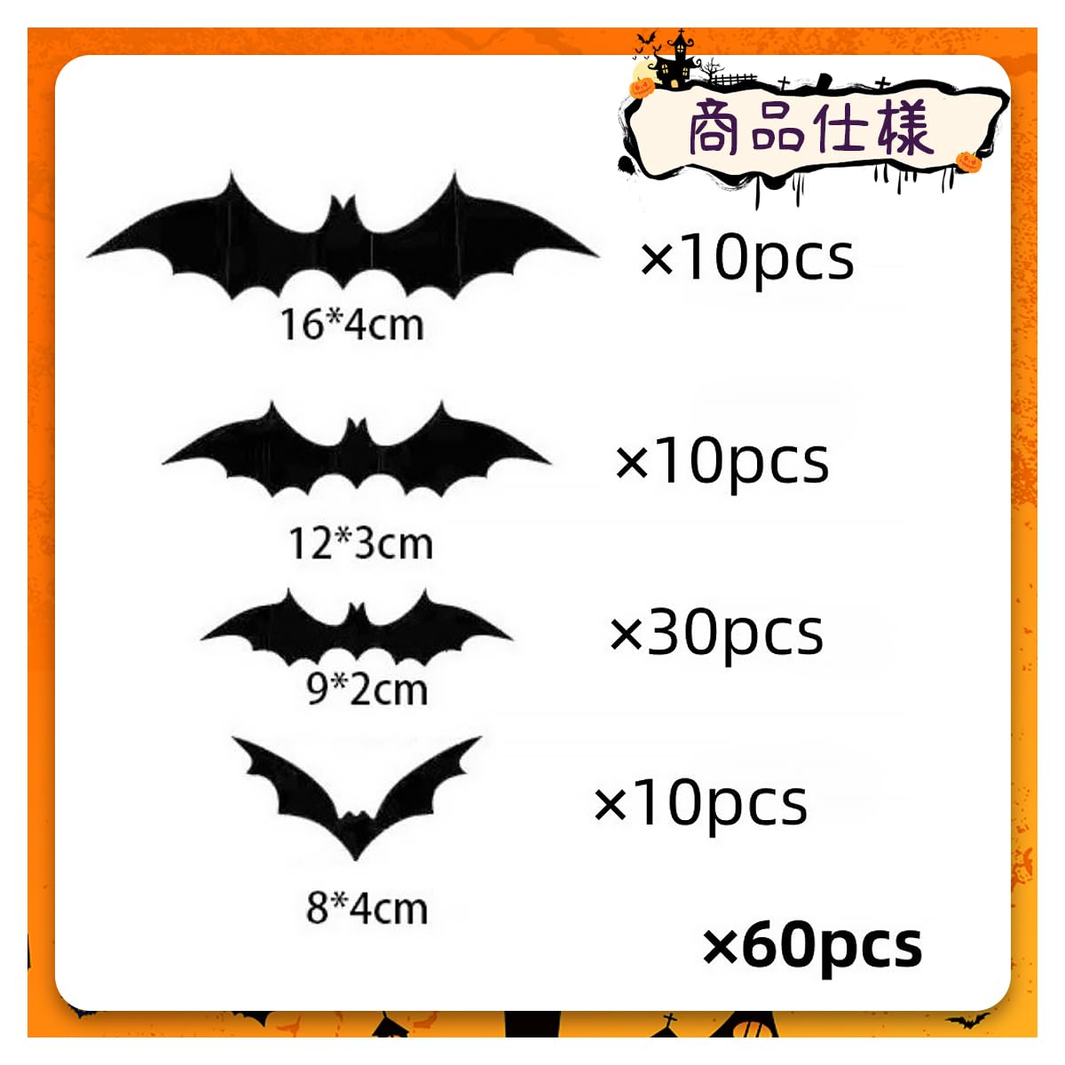 【60 枚 4 サイズ × 両面テープ付き】 セット内容:16×4cm(10 枚)、12×3cm(10 枚)、9×2cm(30 枚)、8×4cm(10 枚)の計 60 枚。専用両面テープ付きで、壁・窓・ガラスなど滑らかな面に簡単貼付可能。ハロウィン DIY 装飾に最適なバリエーションで、大・中・小サイズを組み合わせてリアルなコウモリ群を演出します。