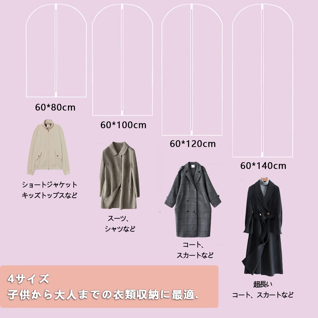 衣類 防塵カバー 5枚組 吊るせる衣類用ダストバッグ 防虫カバー 湿気取り 防カビ コート ダウンジャケット Tシャツ 半袖 スカート パンツ収納袋 洗える 半透明式 繰り返す使用可能 折り畳み可能 60x140cm