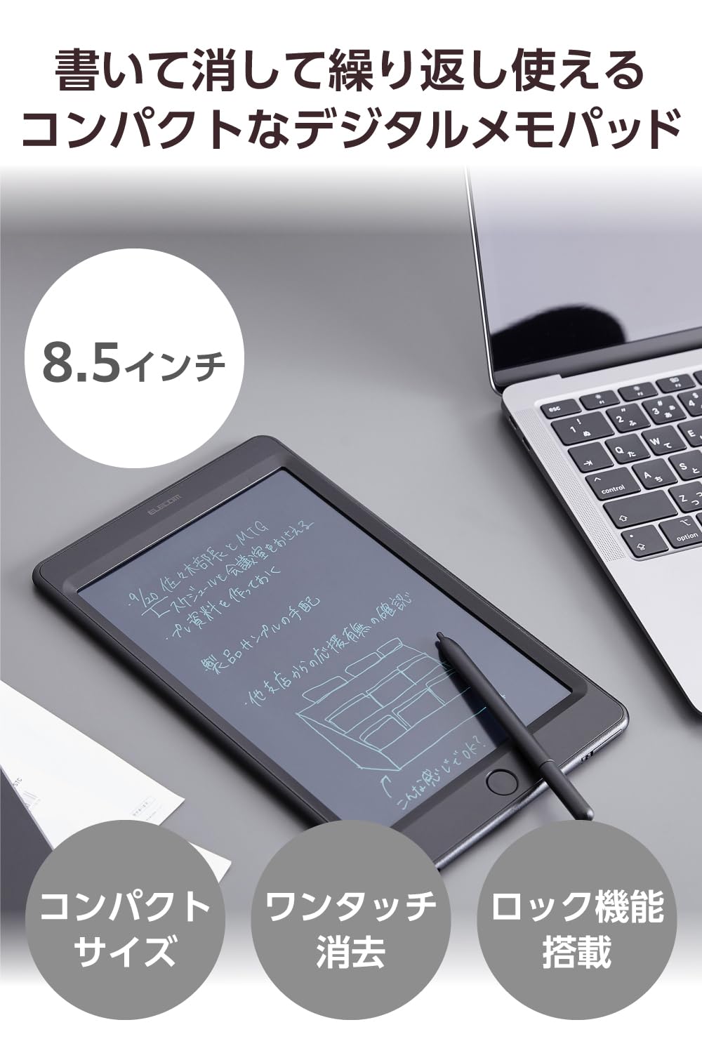 エレコム 電子メモパッド 電子メモ帳 8.5インチ ロック機能付き ワンタッチ消去 電池交換可能 単語帳 筆談ボード 伝言ボード 書いて消せるボード ブラック EP-08BK-AZ