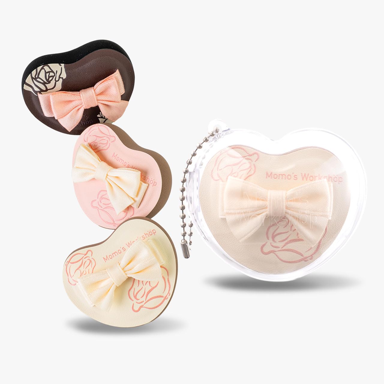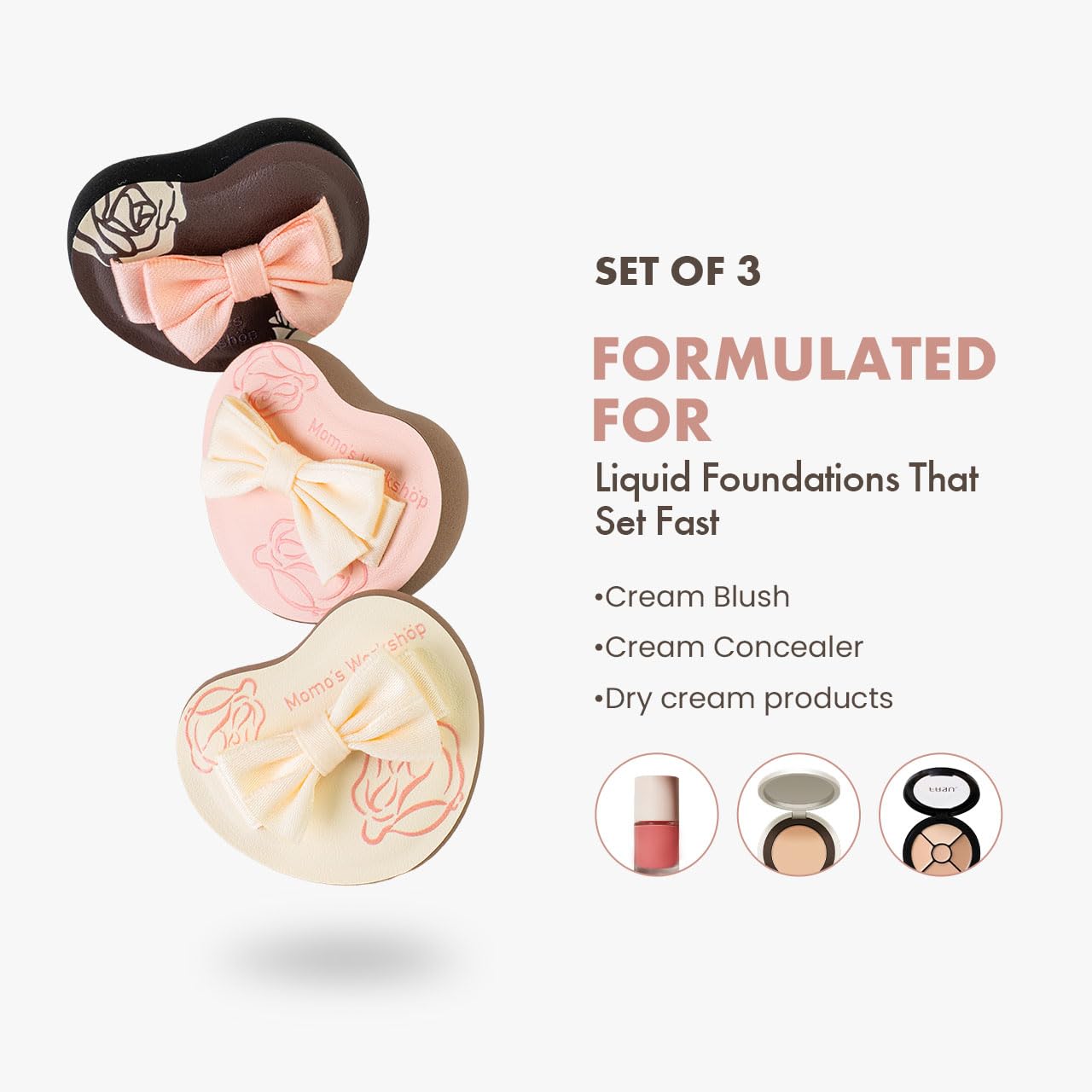 Momo's Workshop ハート型メイクアップスポンジ、しっかり弾むルビーセル、蝶ネクタイストラップ付きファンデーションスポンジ、コンシーラー/クリーム製品の正確なブレンド用、3色、旅行に便利で再利用可能、収納ケース付き