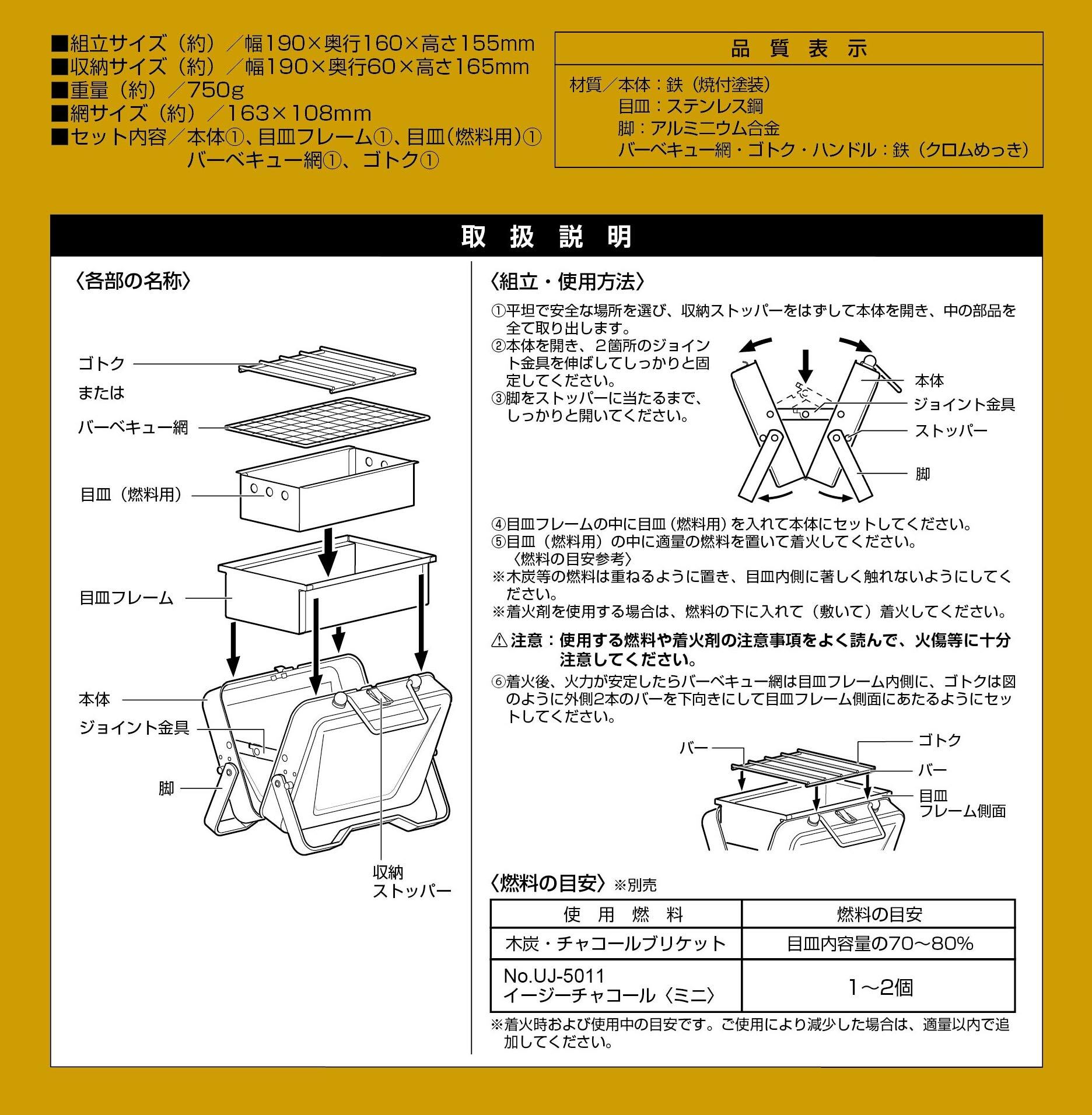 セット内容:本体1、目皿フレーム1、目皿(燃焼用)1、バーベキュー網1、ゴトク1