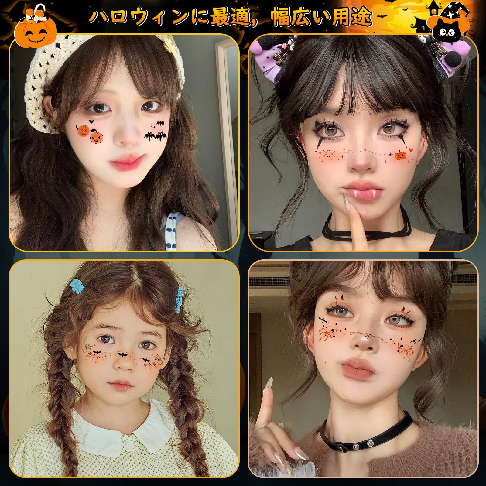 【10点セット、ハロウィン気分たっぷり】ハロウィンタトゥーシールセットには、10種類の絵柄が含まれています。中にはカボチャ、悪魔、巫女、コウモリなどのハロウィン要素でいっぱいです。柄によってメイクや着こなしに合わせ、かわいくて目を引くことができます!