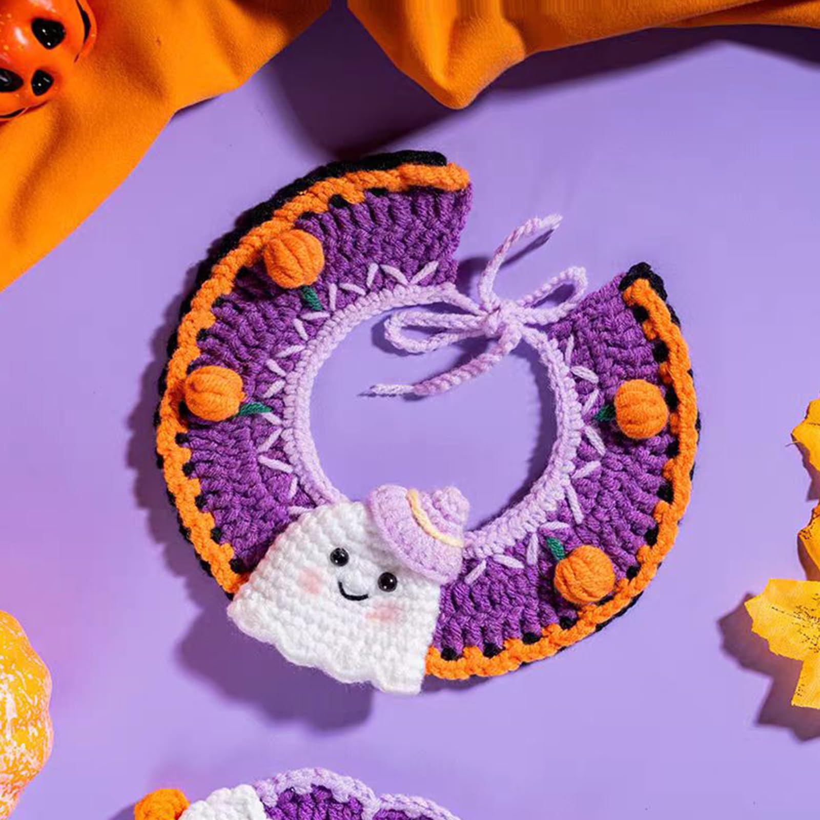 「ハロウィンに最適」:ハロウィンらしいかぼちゃや幽霊の編みモチーフが可愛らしく、つけるだけで季節感たっぷり。全体はやさしい印象のパープルを基調に、オレンジの差し色がアクセントになっており、愛猫や子犬の仮装コーディネートにぴったりの一品です。
