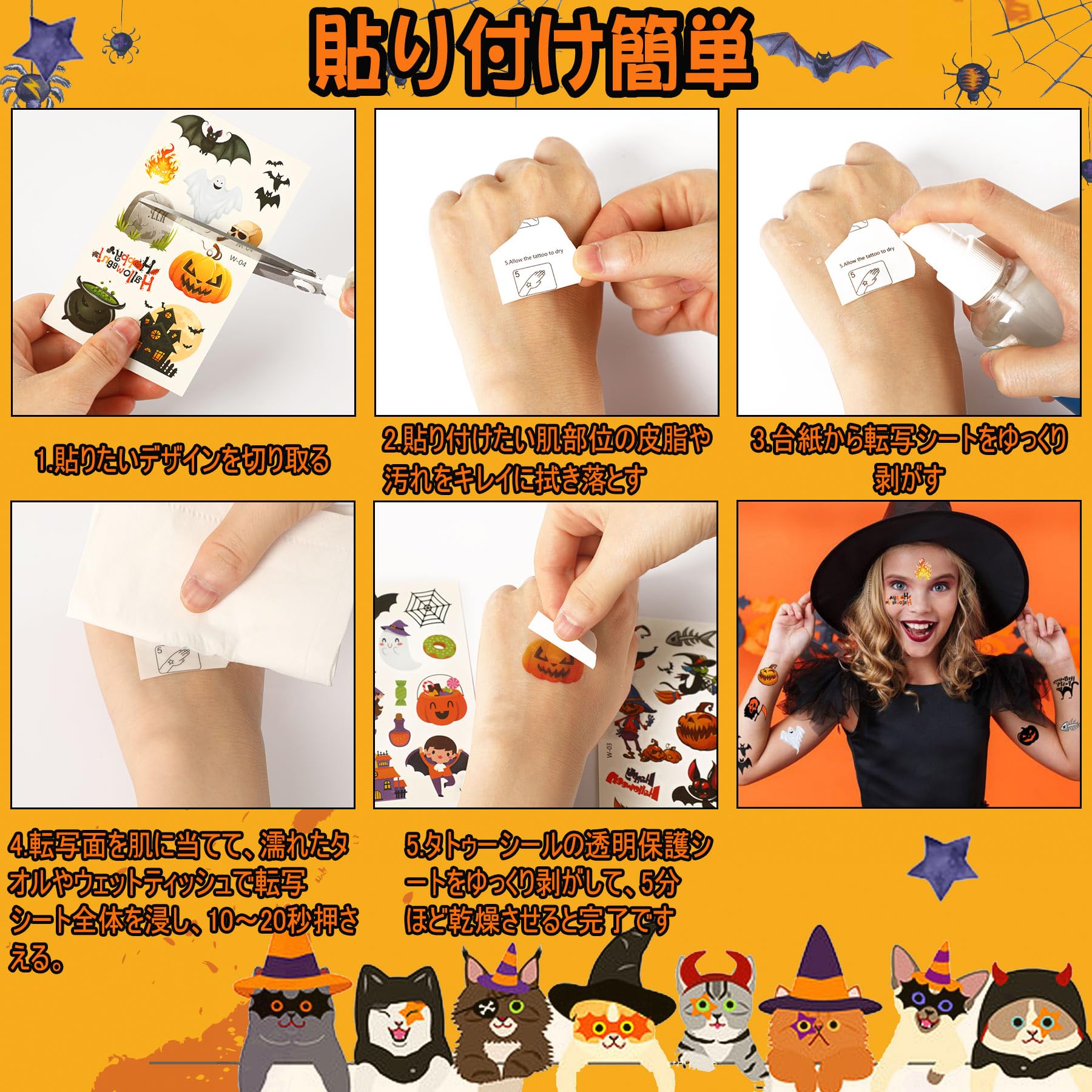 【適用範囲】いい素材を採用しているので、このハロウィン シールは防水性があり、プールや海水浴にも対応できます。そして、自由に貼り付けられ、フェイスや手、首筋、胸、足、好きに楽しめましょう。
