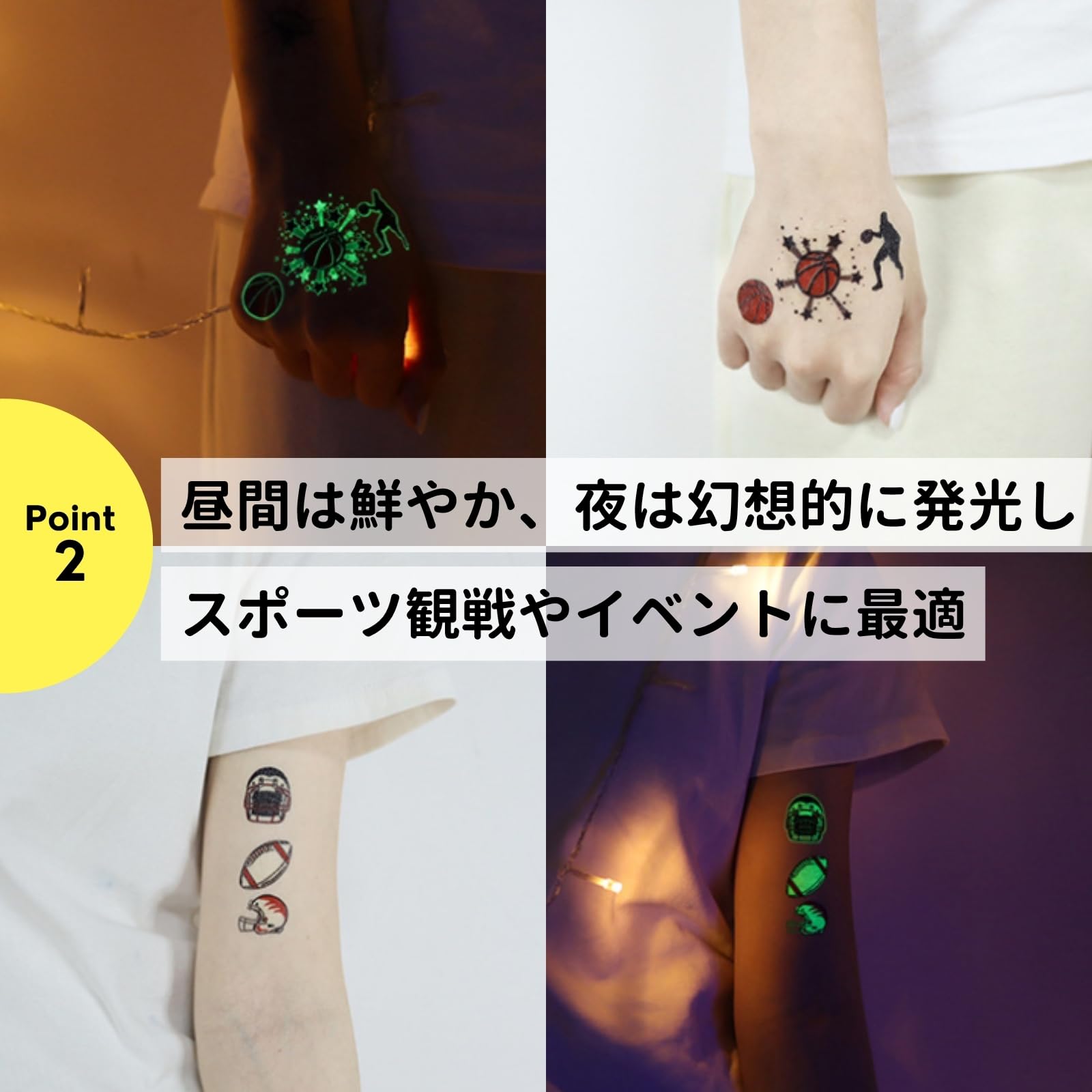 【光る夜光デザイン】暗闇で光る蓄光仕様のタトゥーシール。昼間は鮮やか、夜は幻想的に発光し、スポーツ観戦やイベントで目立ちます。写真映えするのでSNS投稿にもおすすめ。