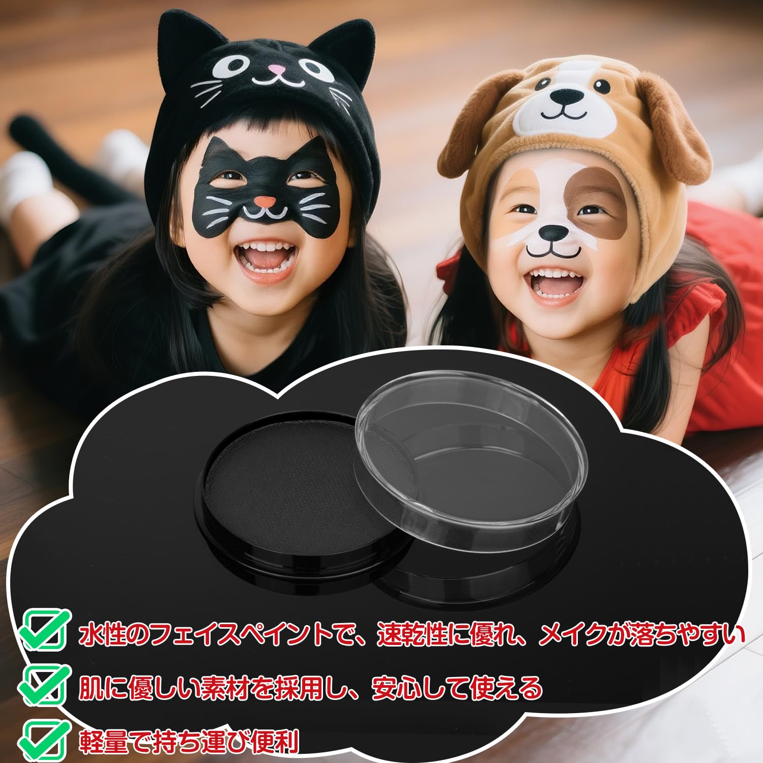 【セットの内容】:フェイスペイント単色(黒)。性質:水性。適応対象:6歳以上。用量:18g。指や筆を使用し、直接に顔や体に塗ってOKです