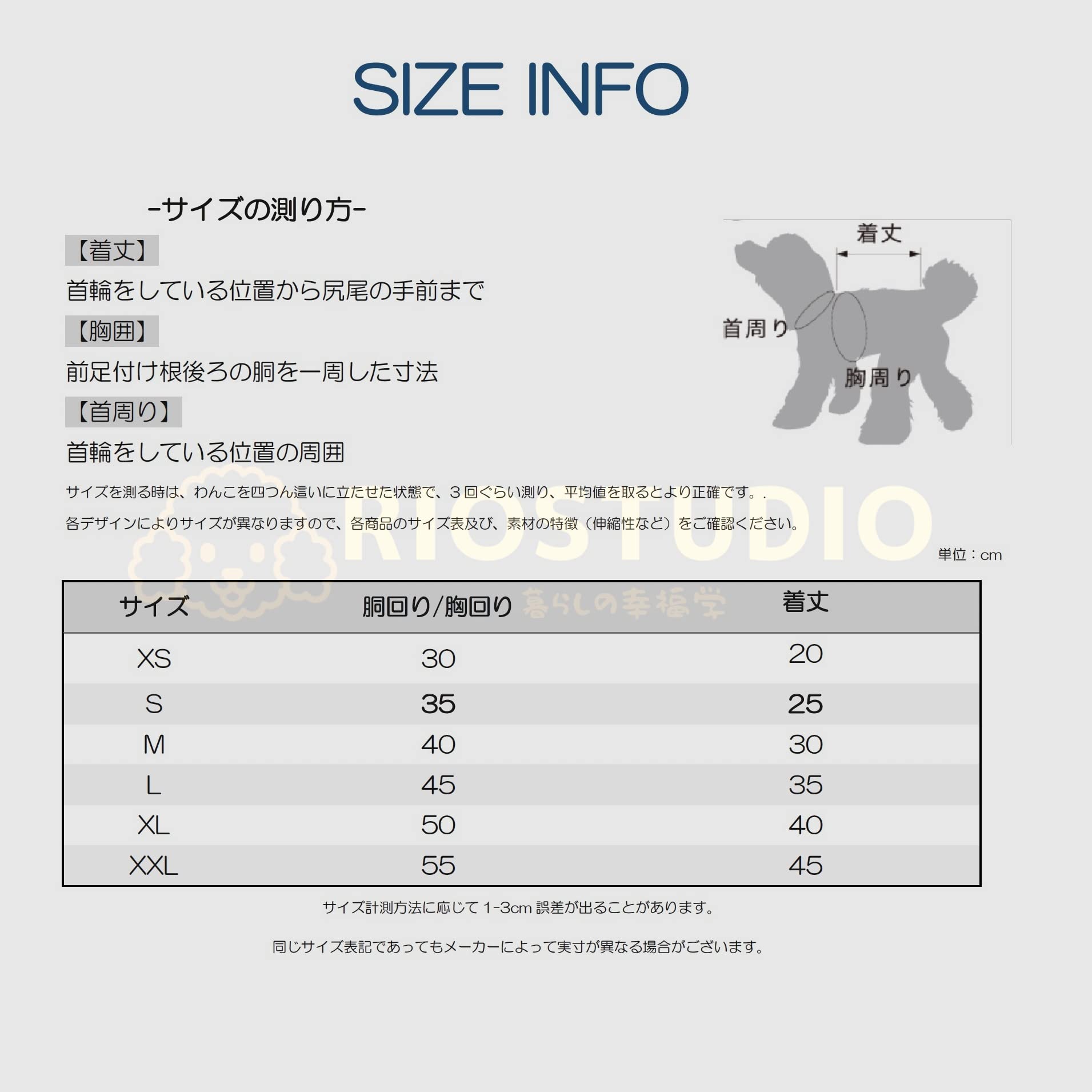 ※こちらの商品は海外輸入品につき、日本国内店頭に置いております商品品質基準と異なる場合がございます。例:裁縫の甘さや小さい穴、梱包時のしわ、接着面のずれやプリントのずれ、多少のほつれやしみ、製品加工工程による匂い、ボタンの取付の甘さ、タグが逆・タグがない、インク飛、裁縫時につけた印(チャコペン)が残っている。※実際の商品に近い色を再現しておりますが、お客様の御覧になっているモニターの色の違いにより実際の商品と色味が異なる場合がございます。ご了承ください。※RIOSTUDIOは安くてより良い品質の商品を目指して、海外のメーカーから商品を厳選しております。あなたの愛犬ちゃんもアイドルになれますので、ぜひチャレンジしてみてください。