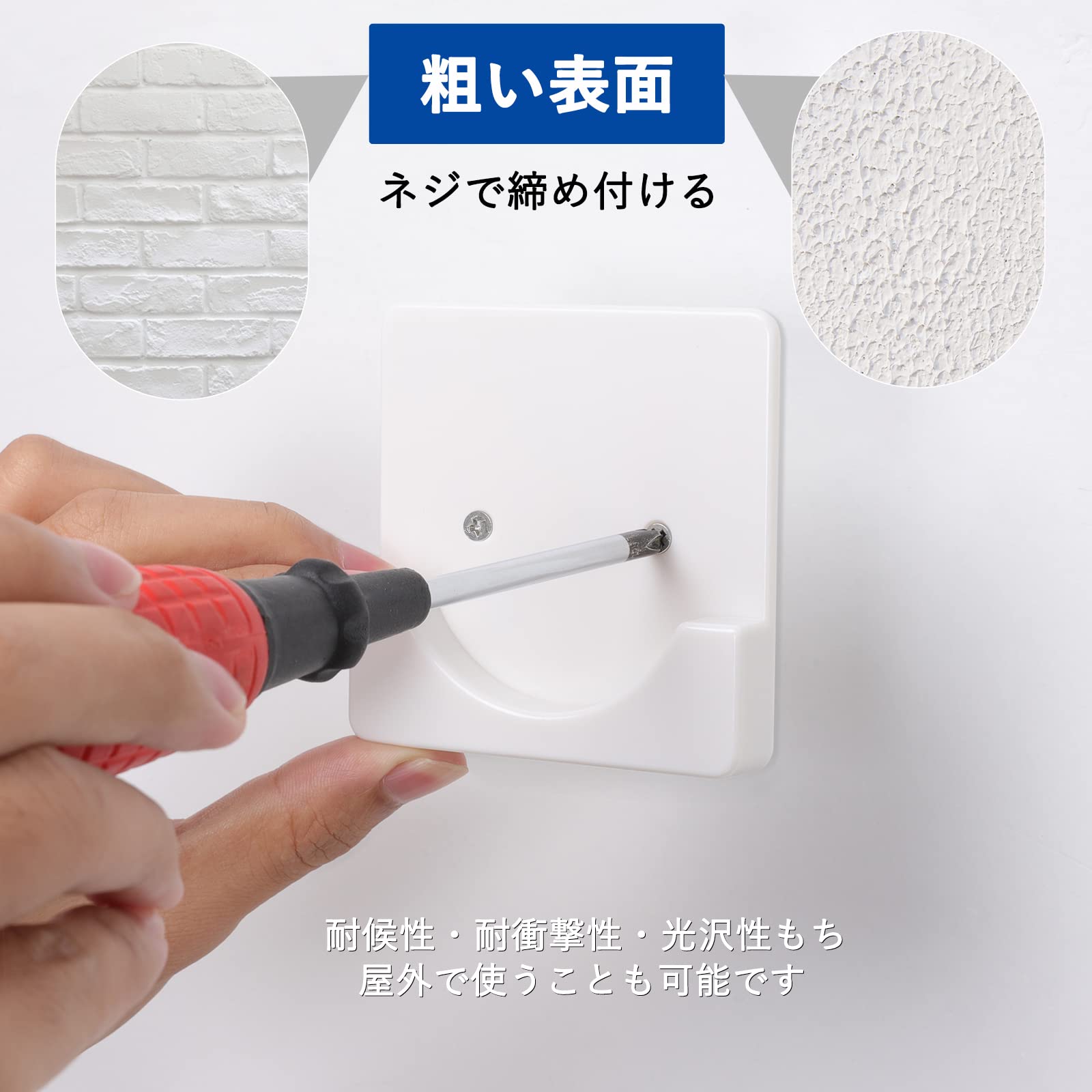 【仕様】サイズは8×8×1.4cm、半円形溝の直径は5.9cmで、直径は5.5cmまでにの突っ張り棒を支えられます、厚さは1.4cm、材質はABS、固定板×2、両面テープ×2、ステンレススクリュー×4、拡張ゴムプラグ×4