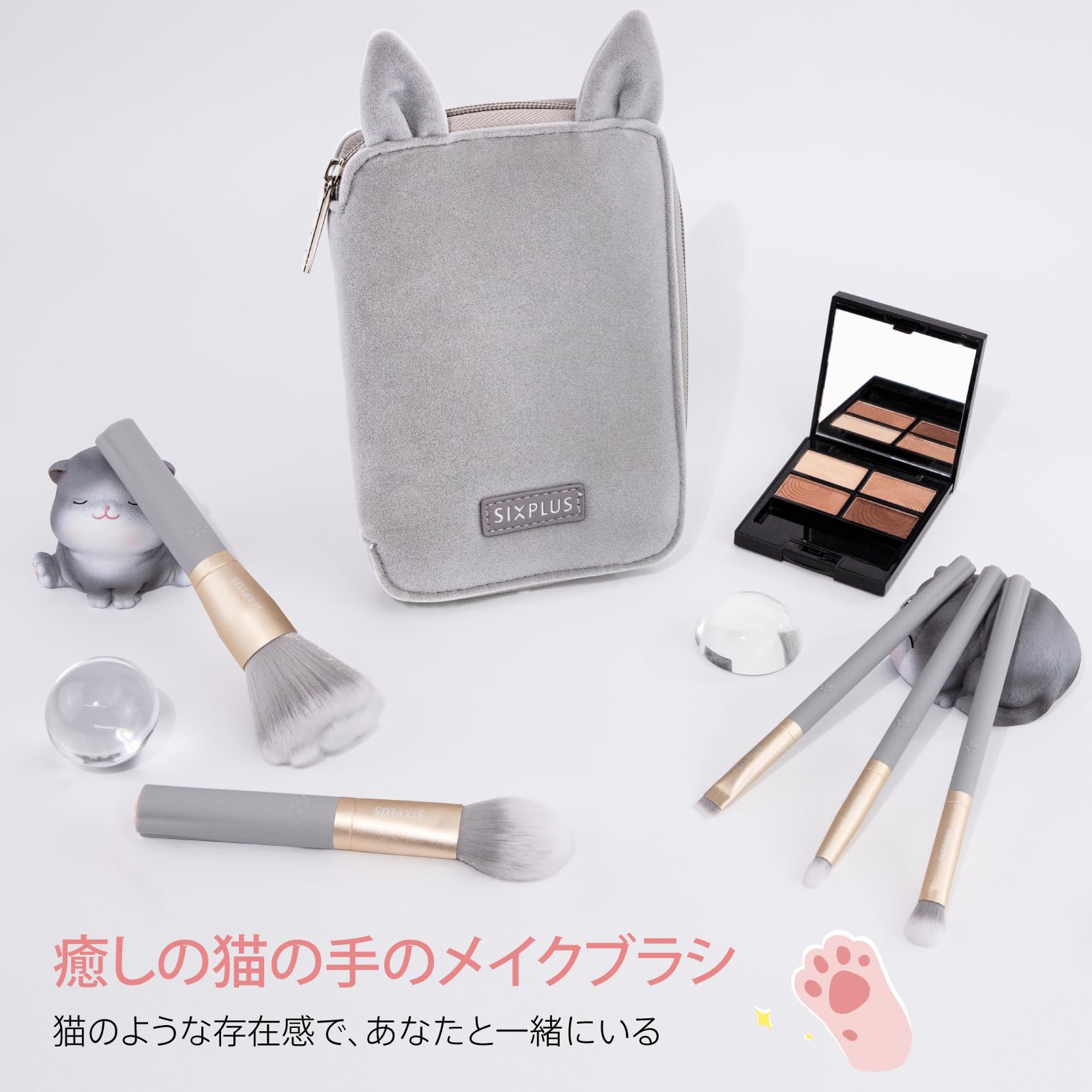 【癒しの猫の手のメイクブラシ】SIXPLUSが心を込めて作った、猫シリーズの5本セットのメイクブラシは、ハンドルの底部とパウダーブラシのブラシ毛に猫の手の形状を施しました。特許取得済み。