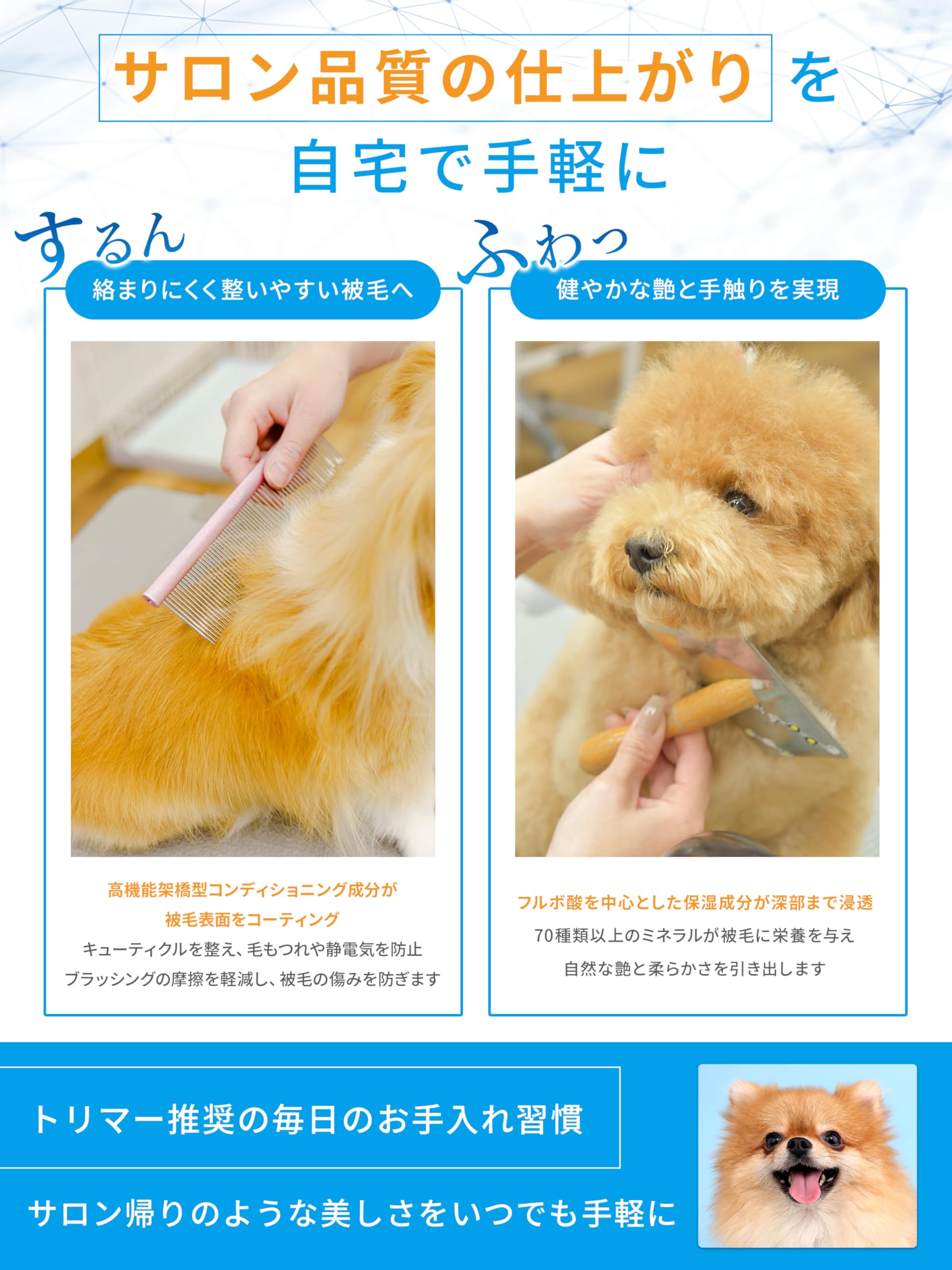 【ブラッシングが劇的に楽になる】吹きかけるだけで優しく被毛コーティングし、ブラシ通りが向上します。もつれや毛玉を予防し、サロン仕上げのような艶やかさが持続します。実際にプロの現場であるトリミングサロンで使用することを前提に開発された製品です。