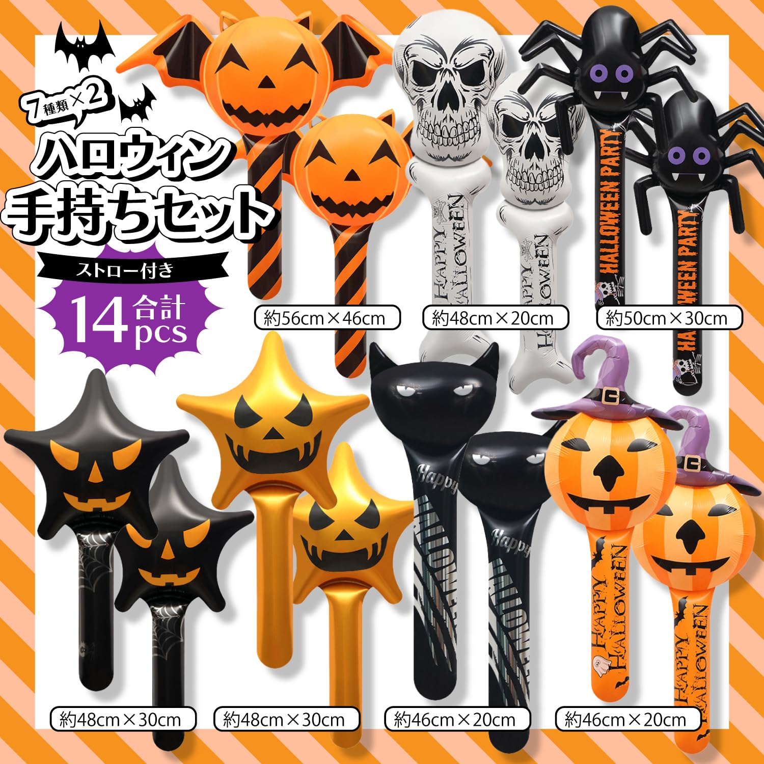 【仕様】 形:ハロウィンのステックバルーン / ・数量:14 ・色:ジャコランタン(46cm×20cm)、羽付きジャコランタン(56cm×46cm)、スパイダー(50cm×30cm)、ブラックキャット(46cm×20cm)、オレンジスター(48cm×30cm)、ブラックスター(48cm×30cm)、スケルトン(48cm×20cm) 各2枚ずつ 計14枚 /・付属品:ストロー5本