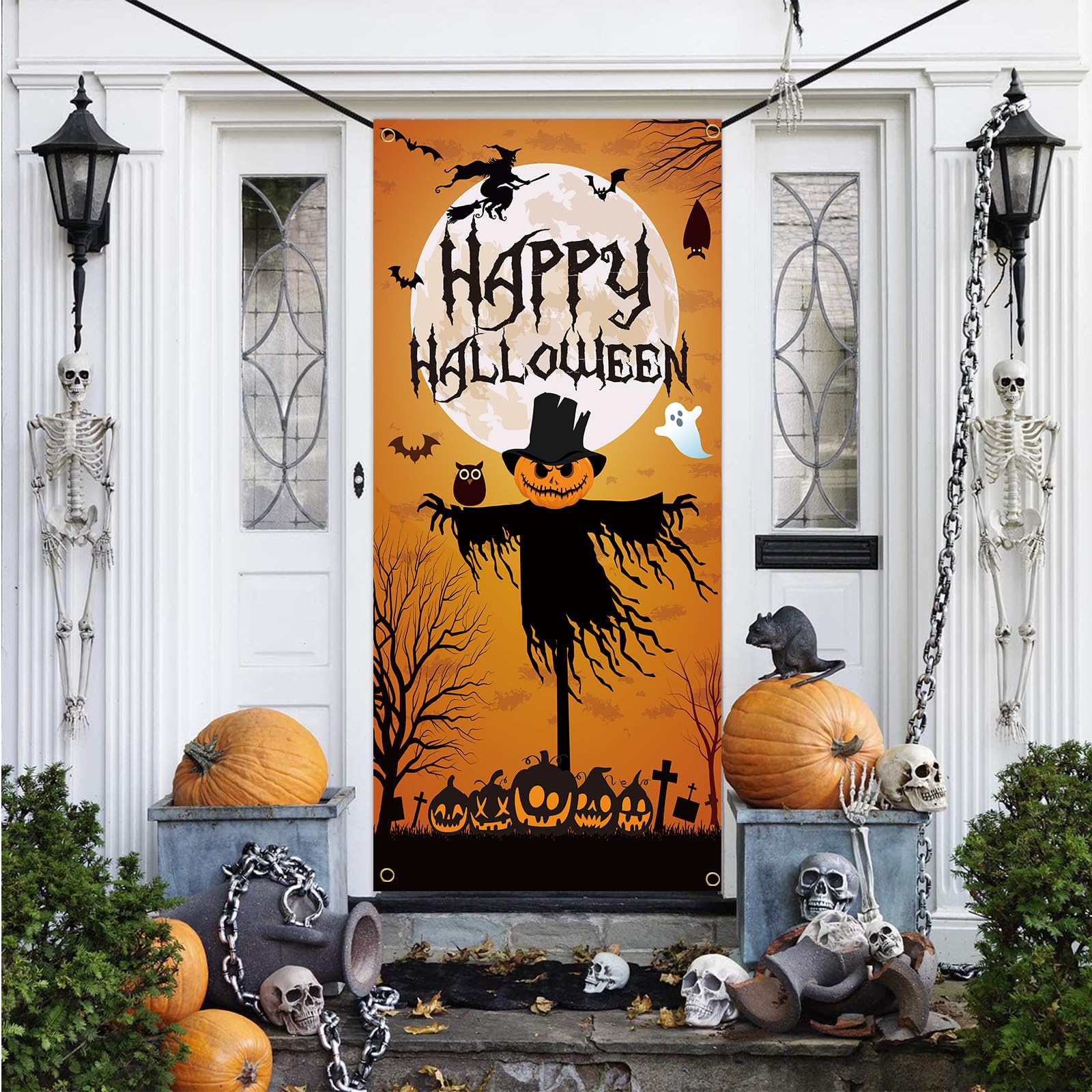 【ハロウィンバナー】:ハロウィンのために特別にデザインされたバナーです。巨大なかかしはドアの前に立っているような姿がプリントされ、ハロウィンの雰囲気満々です。壁に掛けるだけで、ハロウィンの気分を盛り上げます!