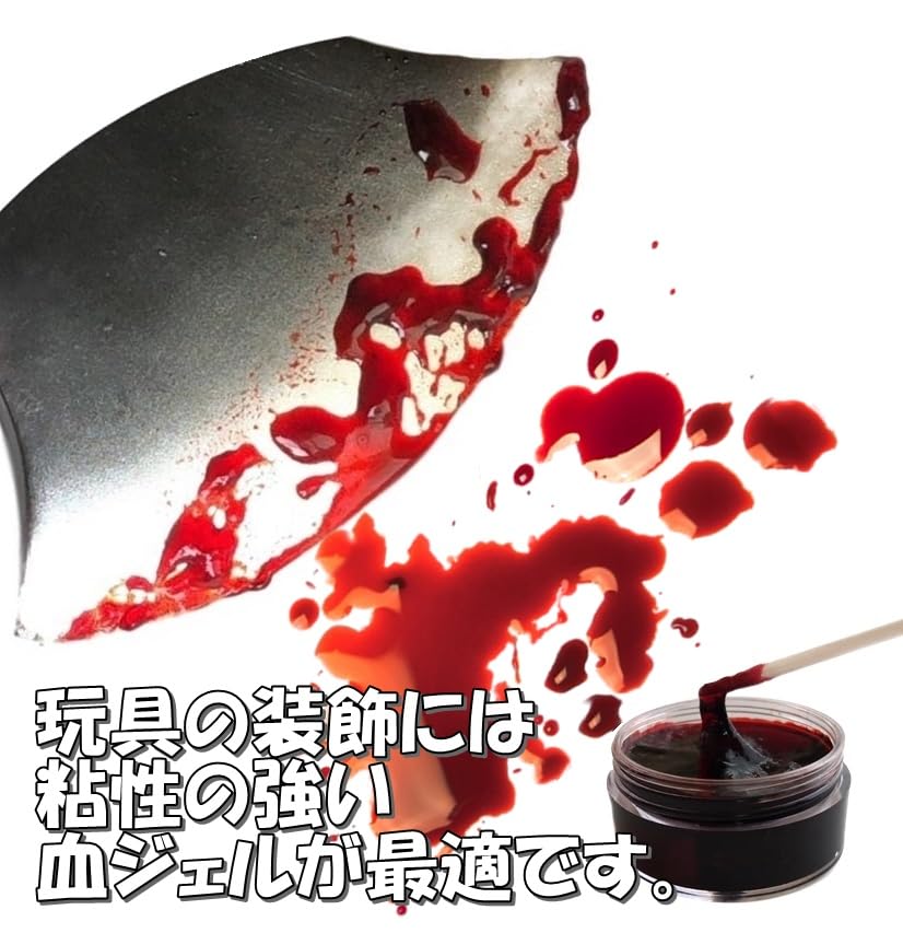 さらさらタイプとジェルタイプを混ぜて使用することで、よりリアルに凝固し始めた血液を演出することが出来ます。※眼の周囲及び口中、唇、粘膜へ御使用することはできません。手に付いた血糊は石鹸を付け、スポンジで擦る様に洗うと落とすことができます。